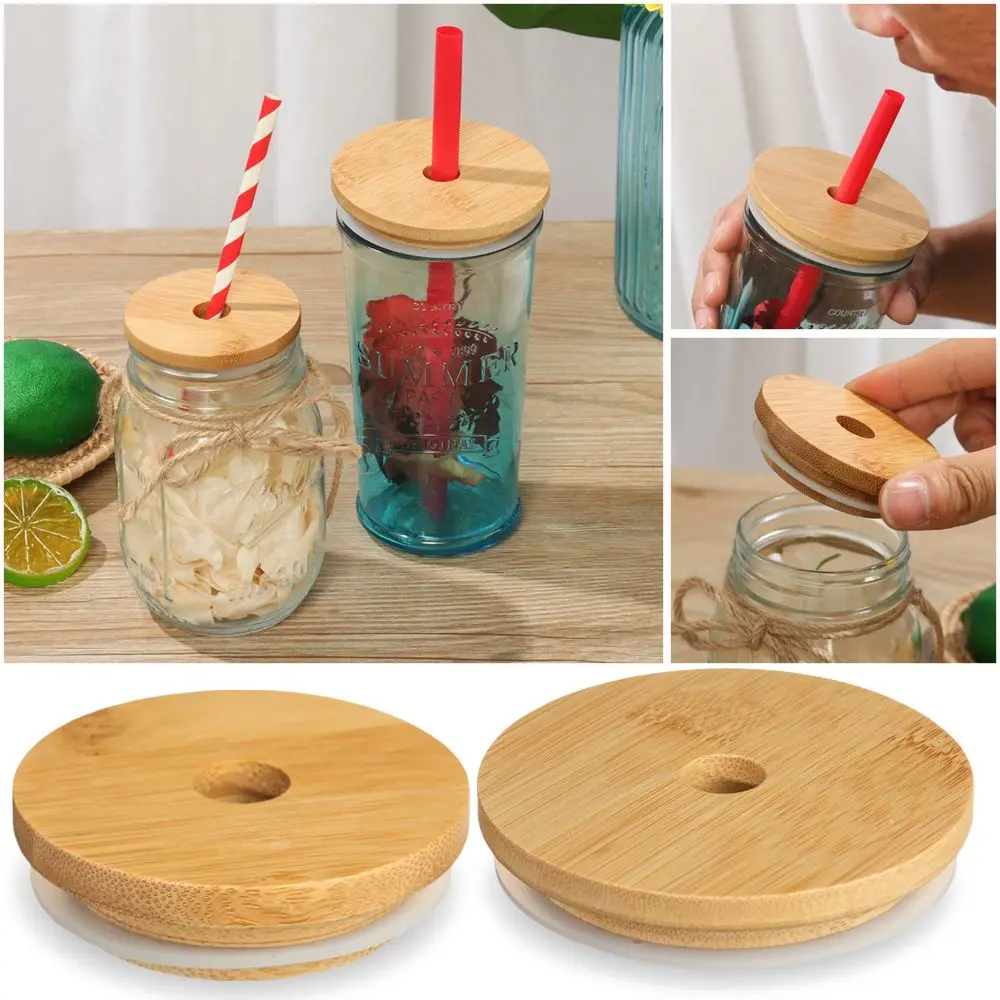 Reusable Bamboo Caps Mason Jar Lids with Straw Hole.