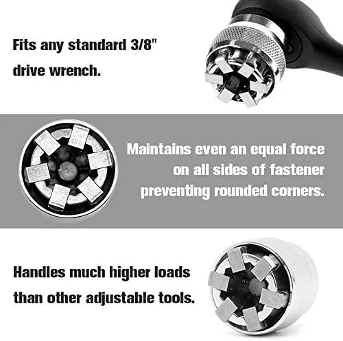 Набор гаечных ключей с широким регулированием: заменяет более 30 розеток от 3/8 "до 3/4" и от 10 до 19 мм. Специальная Самостоятельная Регулировка этих универсальных розеток может соответствовать любому размеру или форме. Отрегулируйте сразу, чтобы захватить большинство гаек, винтов, крючков, винтов, головок болтов и других крепежных деталей нечетной формы, для которых у вас нет подходящего инструмента.