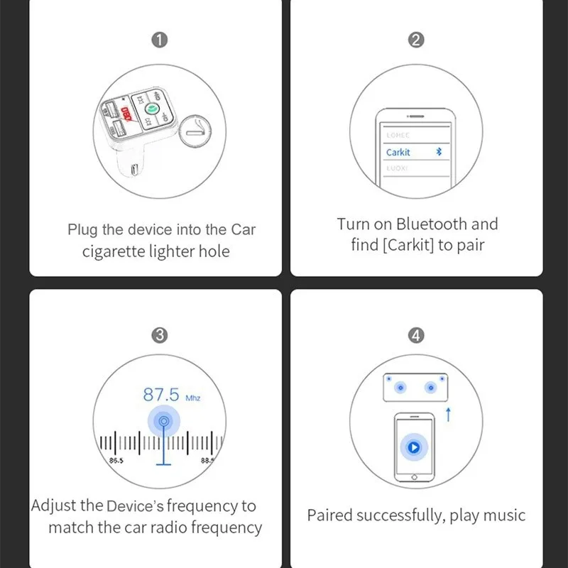 * Этот продукт использует полночастотную технологию беспроводной передачи FM и может напрямую считывать аудиофайлы на Bluetooth мобильный телефон/tf-карту/U-диск. Поддерживает воспроизведение аудио по Bluetooth и звонки по громкой связи по Bluetooth. Поддержка функции smart APP, высококачественное декодирование аудио без потерь; Функция USB для зарядки автомобиля на многофункциональном автомобиле MP3.