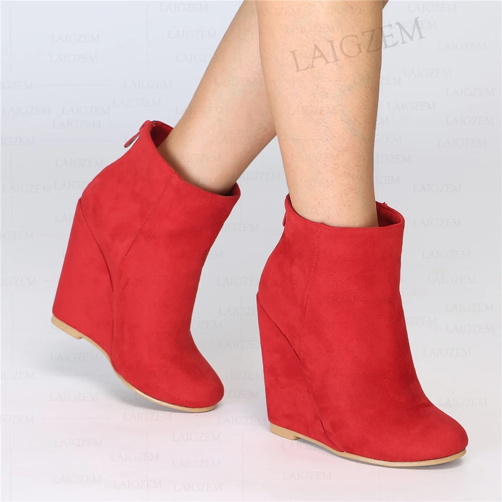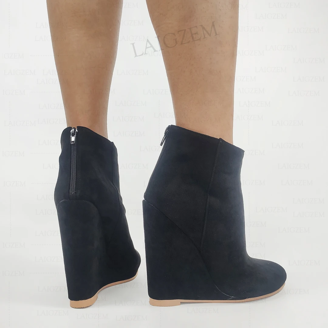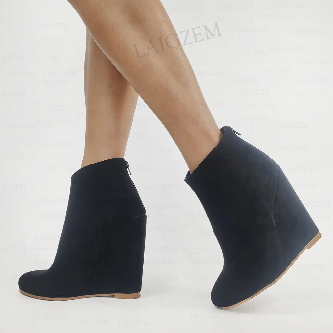 LAIGZEM/женские ботильоны с круглым носком на танкетке; Короткие ботинки на молнии; Женская обувь из искусственной замши; Большие размеры 41, 43, 47, 52