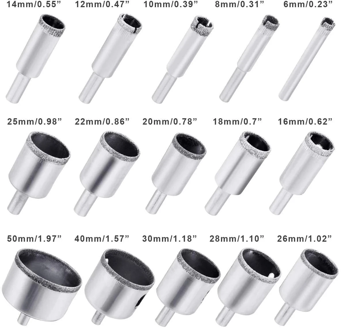 Спецификация:Алмазные сверла 15 РазмеровМатериал: высококачественная сталь, Алмазное пылезащитное покрытиеРазмер: 6 мм (1/4 "), 8 мм (5/16"), 10 мм (3/8 "), 12 мм (1/2"), 14 мм (9/16 "), 16 мм (5/8"), 18 мм (11/16 "), 20 мм (3/4"), 22 мм (7/8 "), 25 мм/(1"), 28 мм (1-3/32 "), 30 мм (1-1/8"), 35 мм (1-1/3 ") , 40 мм (1-1/2"), 50 мм (2 ") Кольцевая пила:Материал: резиновая основа + Пластиковый корпус + стальМинимальный размер сверла: 1/8"Максимальный размер отверстия пилы: 3-1/4" Упаковка включает:1 * направляющее приспособление для кольцевой пилы15 * сверла с алмазным покрытием1 * отвертка Особенности:* 15 Размеров алмазная пила: 6 мм, 8 мм, 10 мм, 12 мм, 14 мм, 16 мм, 18 мм, 20 мм, 22 мм, 25 мм, 28 мм, 30 мм, 35 мм, 40 мм, 50 мм, изготовлены из высокопрочной углеродистой стали, интегрированная стальная структура делает эти алмазные сверла более прочными. * Алмазные Кольцевые пилы, покрытые высококачественным алмазом, увеличивают скорость сверления и создают остроту, высокую точность и гладкость резки без сломанных краев за считанные секунды. * Регулируемое отверстие пилы сверло направляющее приспособление с всасывающим основанием. Максимальная длина отверстия платформы составляет 3-1/4 ", достаточно большая, чтобы поместить в отверстия всех размеров пилы. * Съемные шариковые подшипники, 2 режима (3 или 4 крепления подшипников) являются необязательными для вас, просто переверните пластину. Направляющая пила или сверло для сверления прозрачных отверстий на плитке, стекле, мраморе, столешнице, граните и т. д. * Сверлильные отверстия для стекла, плиточных бутылок, банок для блоков, керамической плитки из стекловолокна, сланца, гранитный светильник