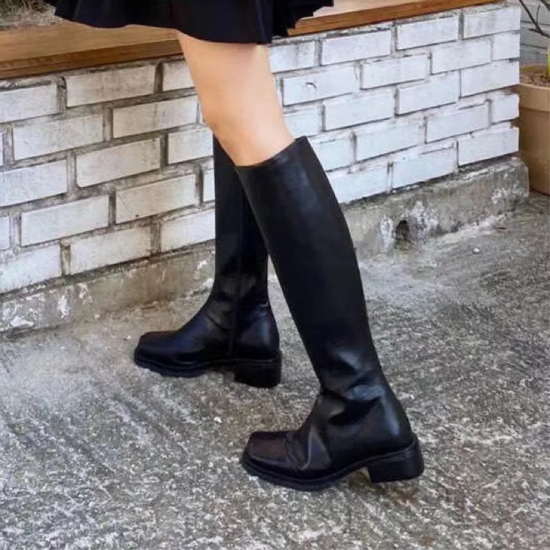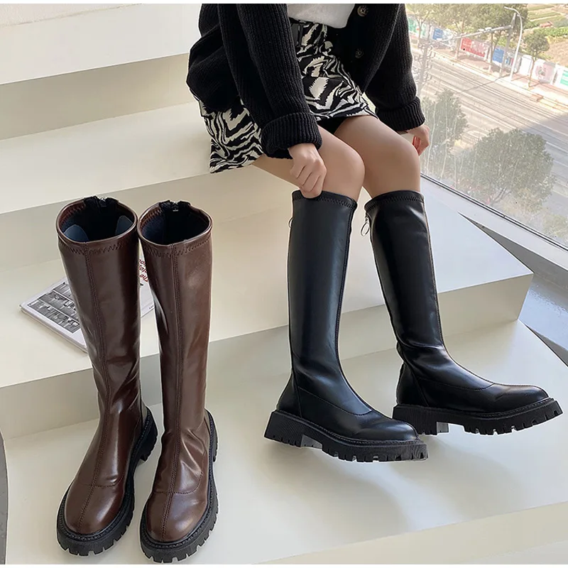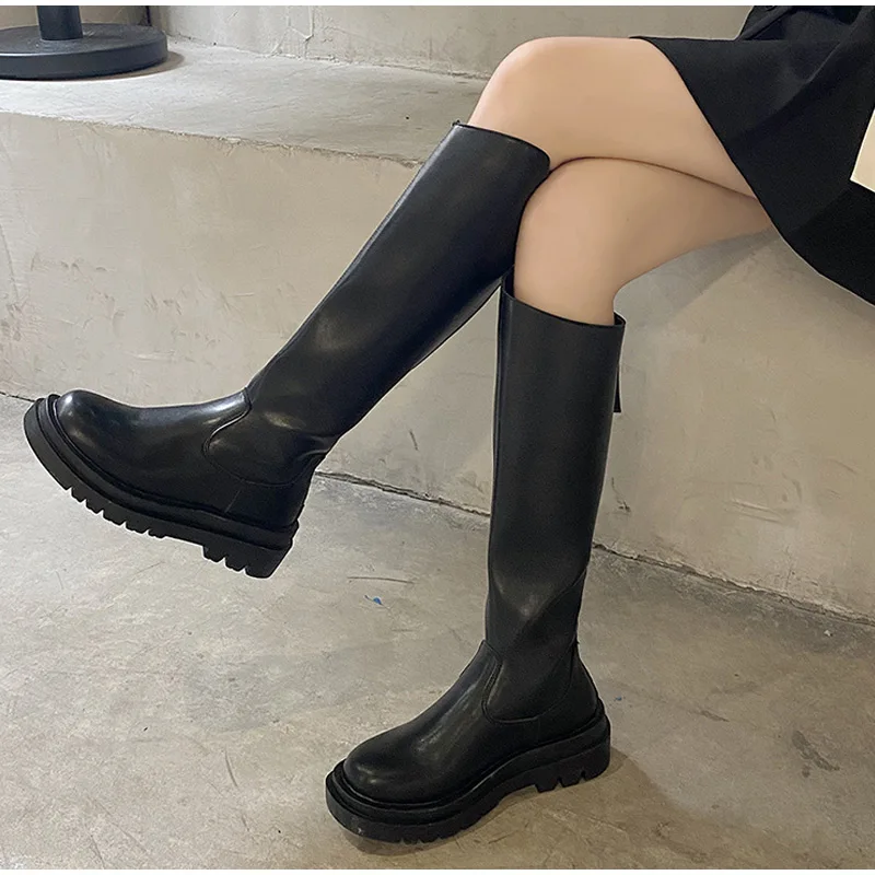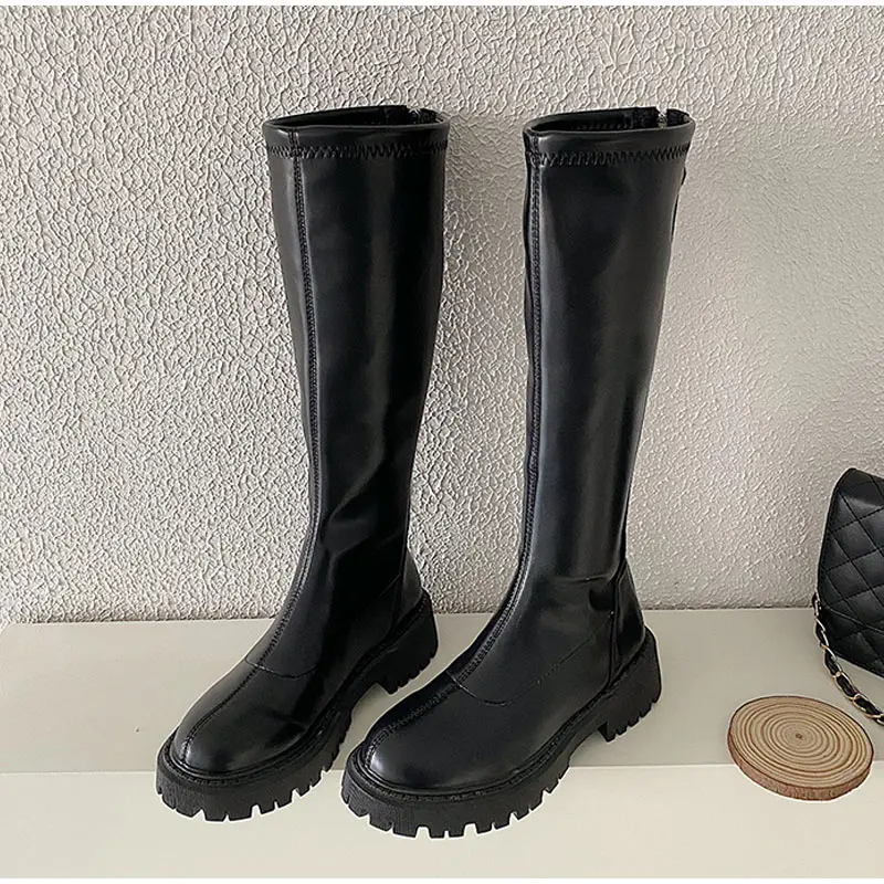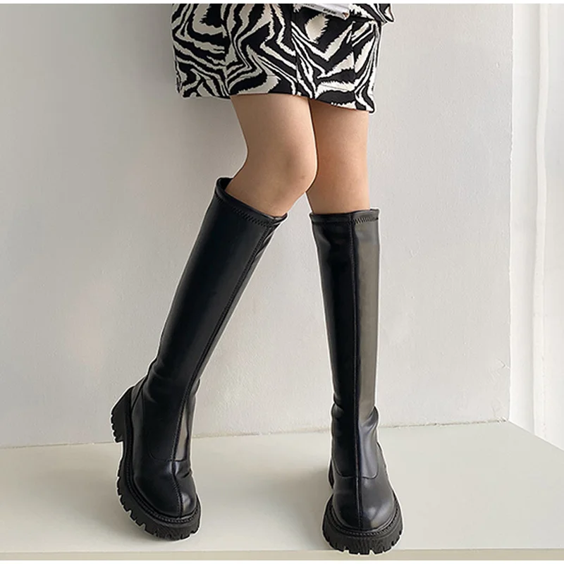 Женские сапоги до колена из мягкой искусственной кожи, высокие сапоги без застежки, женская обувь на толстой платформе, Осень-зима 2021