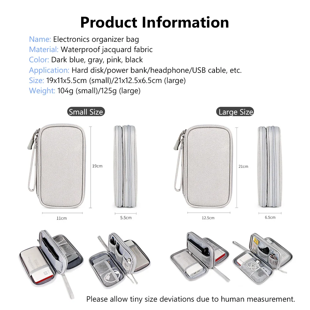 Особенности!100% Новинка!Путешествия органайзер для электроники корпуса для телефона, аксессуары сумка наушник Зарядное устройство USB кабель шнуры для хранения Органайзер, сумка, карман чехол.!Водонепроницаемость и долговечность. Чехол для кабеля изготовлен из водонепроницаемой жаккардовой ткани и нейлона. Прочный и прочный материал с мягкой пеной для защиты всех вещей внутри от царапин, пыли, ударов и случайного падения. Легко мыть и чистить.!Портативный и безопасный. Тонкий и легкий дизайн позволяет легко проскальзывать в сумку или просто носить каждый день со встроенным ремешком. Прочные молнии и эластичные сетчатые карманы надежно сохраняют ваши предметы и предотвращают их выпадение или беспорядок!Большая емкость. Двухслойный дизайн с 3 большими отделениями и 5 маленькими сетчатыми карманами внутри, может держать ваши различные электронные гаджеты, такие как мобильный телефон, внешний аккумулятор, кабели, зарядное устройство, наушники, usb-накопители и sd-карты, также хорошо подходит для ручек, канцелярских принадлежностей и т. Д., легко отделяется и сохраняет их на месте.!Идеально подходит для школы, дома, офиса, путешествий или просто повседневного использования. Отличный подарок для себя, а также хороший подарок для семьи и друзей!!Характеристики!Материал: жаккардовая ткань, нейлон, мягкая пена!Цвет: темно-синий, серый, розовый, черный!Размеры: около S-19x11x5.5cm/7,5x4,3x2,2 "(Д x Ш x В), M-21x12.5x6.5cm/8,3x4,9x2,6" (Д x Ш x В)!!Внимание!Пожалуйста, учитывайте небольшие отклонения в размере из-за измерения человеком!Из-за эффекта светильник и яркости монитора, его возможны незначительные отклонения s светильник различия между цветовых тонах между фотографией и самим товаром.!!Посылка включена!1 x органайзер для электроники
