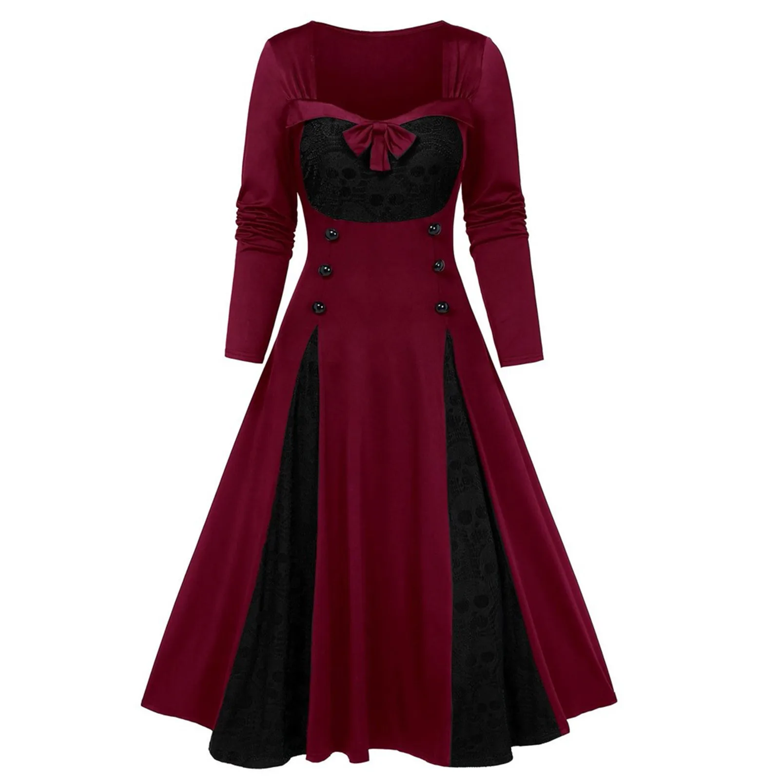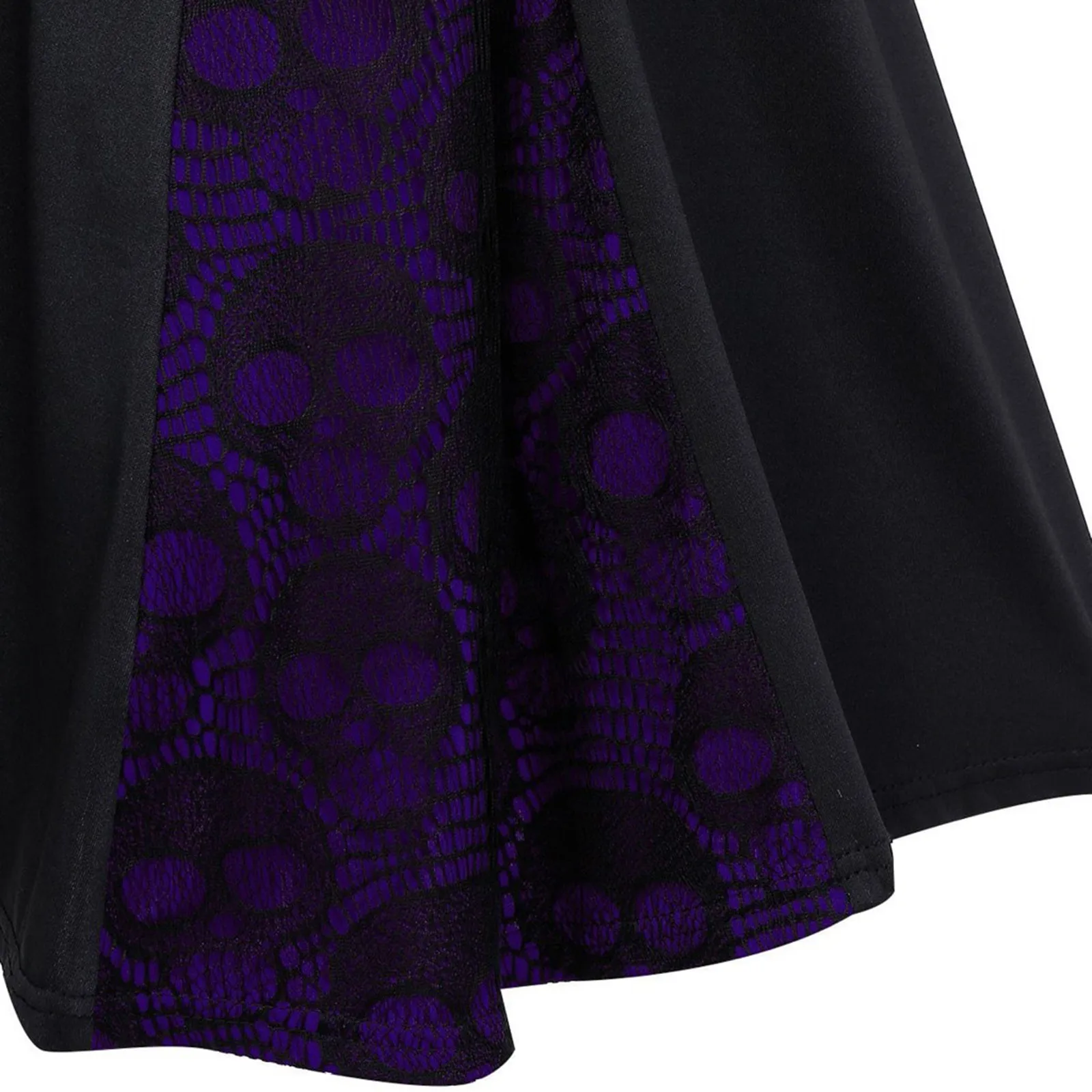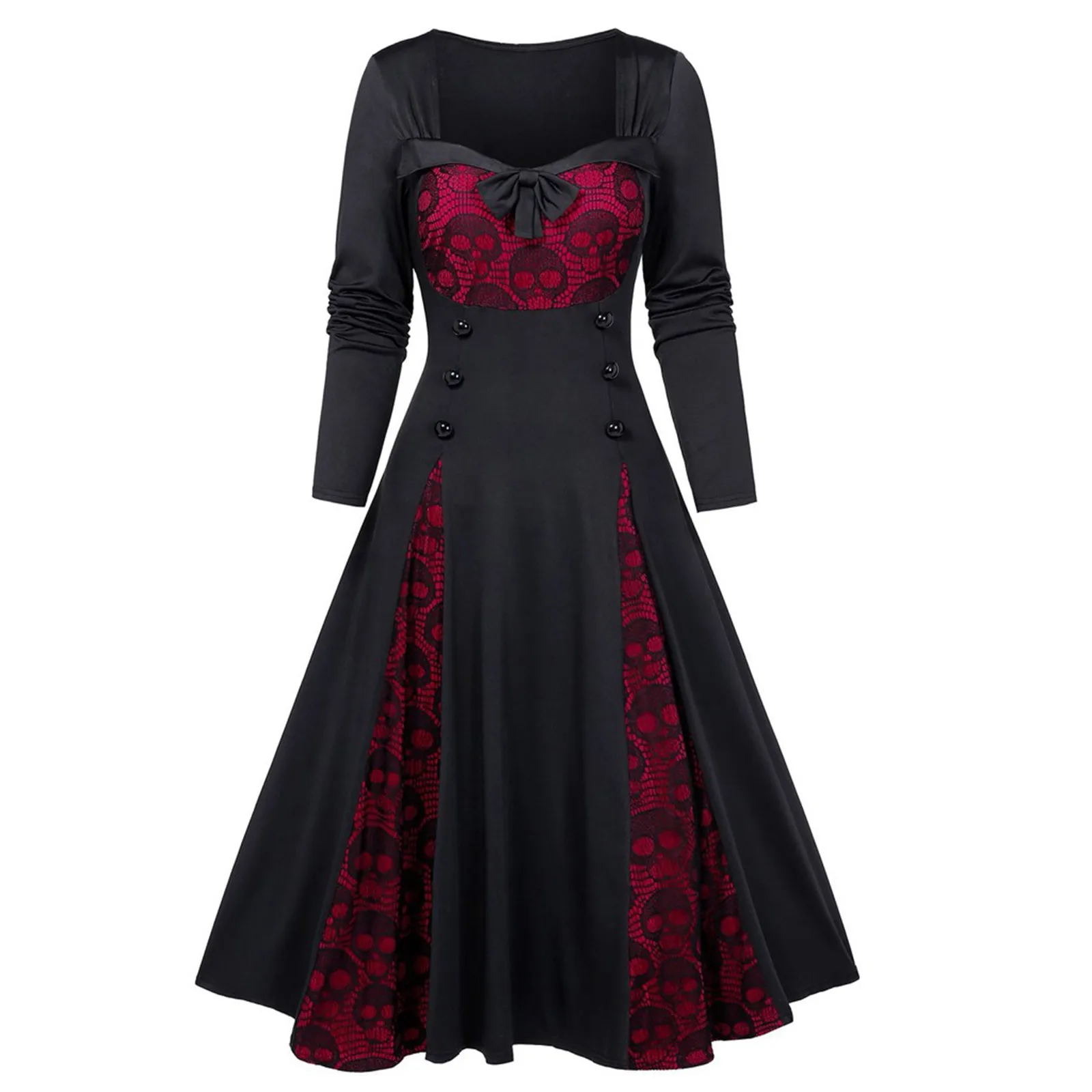 Женское платье с длинным рукавом, однотонное винтажное платье средней длины с длинным рукавом, украшенное кружевом в виде черепа, в готическом стиле, для Хэллоуина, большие размеры