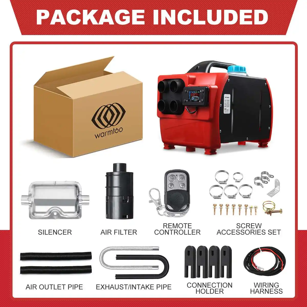 Посылка включает в себя:1x парковочный обогреватель (Новый ЖК-термостат)1x 4-туннель пульт дистанционного Управление (аккумуляторы в комплект не входят)1 глушитель1x воздушный фильтр1 Воздушная выпускная труба1x впускная труба1x выхлопная труба4x Соединительный держатель1x жгут проводов1x набор крепежных Аксессуаров1x Руководство пользователя