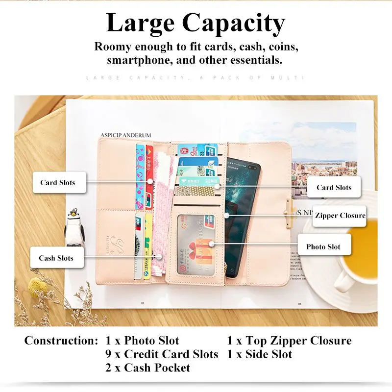 Особенности:1. Большой объем, этот кошелек для телефона состоит из 1 основного отделения, 9 слотов для карт, 1 слота для фотографий и 2 слота для наличных.2. Деньги, карты могут быть хорошо расположены в другом слое.3. Выразительный и изысканный внешний вид, изготовленный из качественной искусственной кожи, гладкий и мягкий на ощупь.4. С защитной пряжкой, это может обеспечить вам полное чувство безопасности.