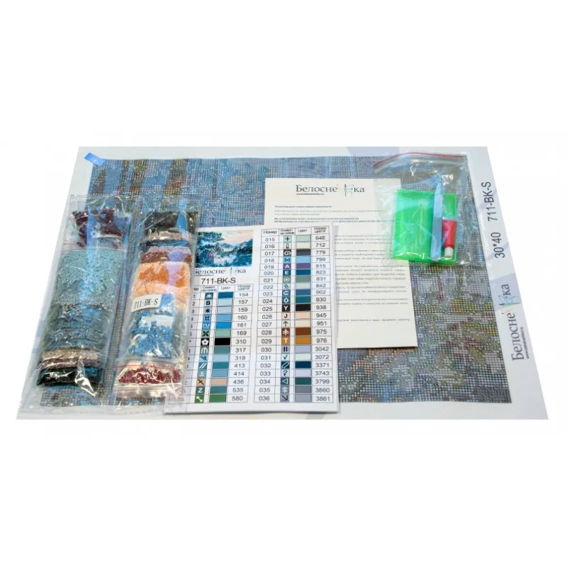 Основа картины – холст с напечатанной цветной схемой с контрастными условными обозначениями, холст покрыт высококачественным клеевым слоем и сверху закрыт пленкой, которая предотвращает высыхание клея.