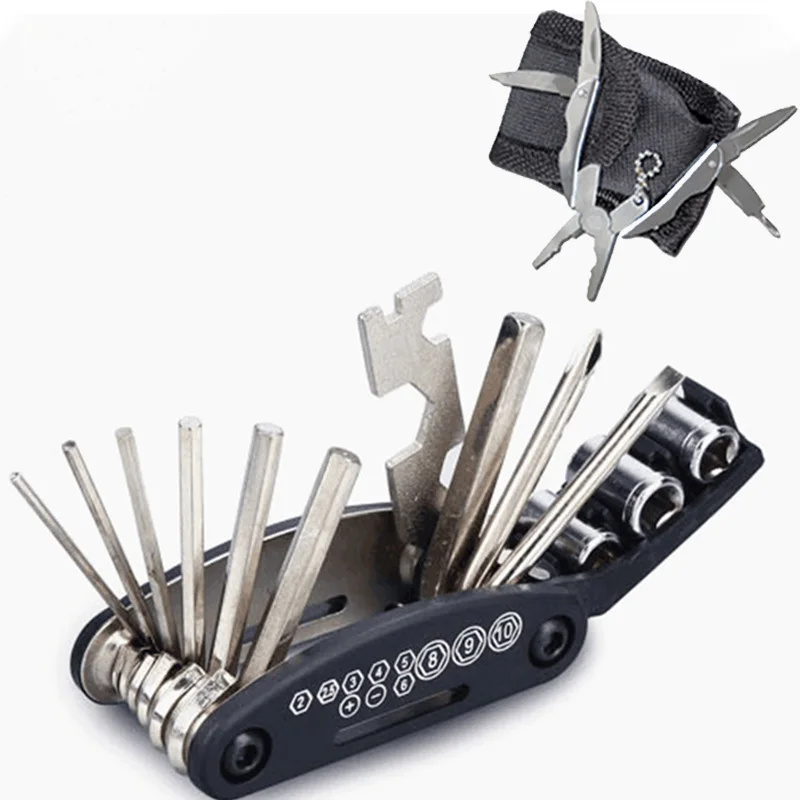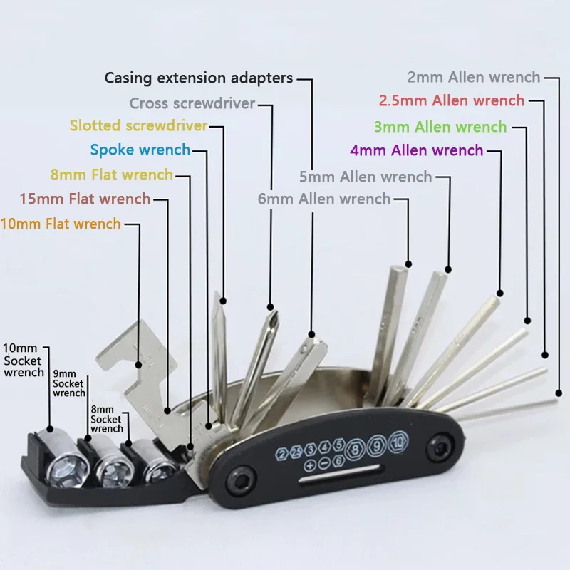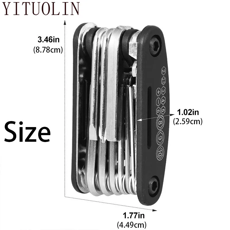 This high quality toolkit: With 16 in 1 tool kit : 3 kinds of Socket Hex Wrench 8/9/10/mm, 1 Slotted Screwdriver, 1 Phillips Screwdriver, 6 kinds of different inner Hex Key Wrench 2/2.5/3/4/5/6 mm, 1 spoke wrench and 1 sleeve extension rod, 4 kinds of Flat wrench 8mm/10mm/15mm/14GE.Durable handy and compact: It is only 3.54"x1.69"x0.98" Made of high-quality carbon steel and ABS material, durable, stronger. Helping you fix most problems of bikes when you are riding outside and perfect accessories for general bike repairing.