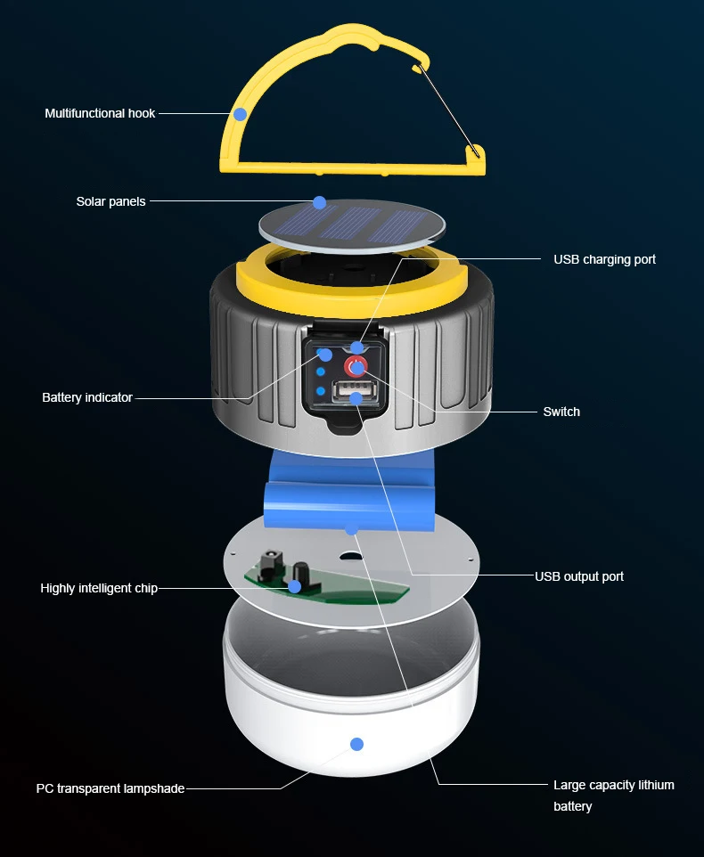 Светодиодный светильник онарь на солнечной батарее, портативный, перезаряжаемый, USB-зарядка, водонепроницаемый, для кемпинга, походов, рыбалки