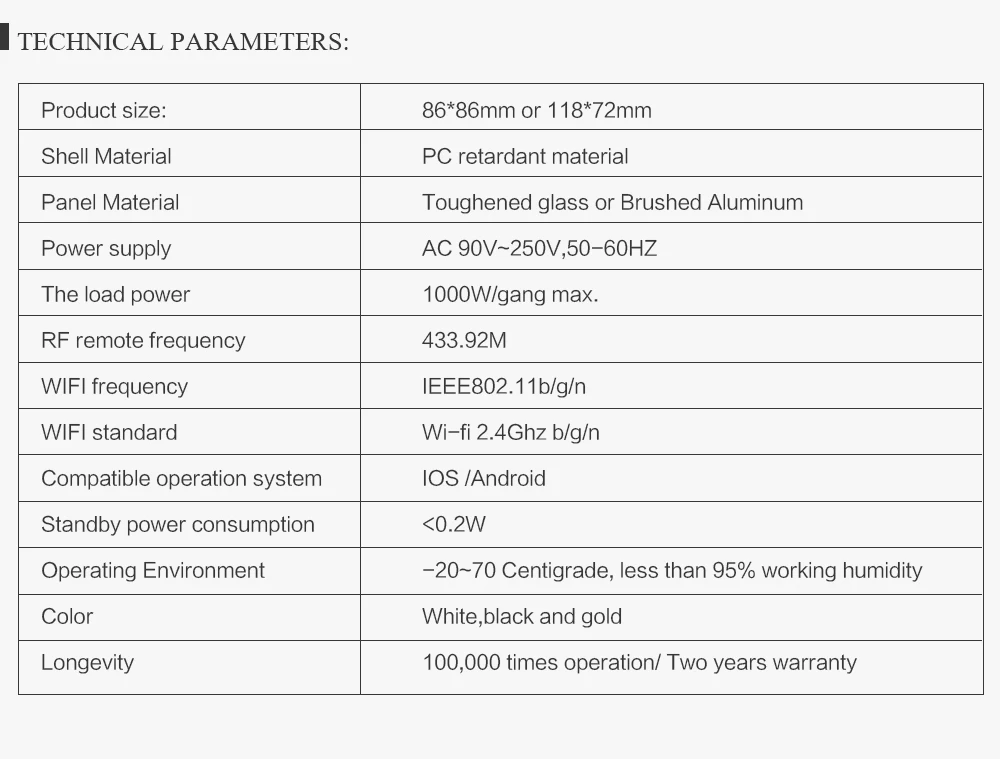 1. Доступны популярные цвета: черный, белый, серый2. Закаленное стекло высшего качества и пластиковый материал ПК3. Различные проверки качества во время производства, чтобы гарантировать, что каждый переключатель хорошо работает перед доставкой клиентам.4. Элегантный внешний вид, идеально подходит для многих современных стилей декора. Можно применять в гостиной, спальне, коридоре, кухне, ванной, офисе и так далее.5. Все модули оснащены железными когтями, просто закрутите винты для установки.6. Водонепроницаемый и устойчивый к царапинам. Защита от поражения электрическим током.7. Четыре угла железной пластины имеют одинаковый угол, что делает diy более удобным и свободным для переключения8. Можно настроить
