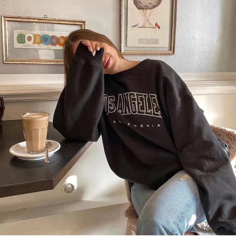 Женская толстовка с длинным рукавом, винтажная Толстовка Оверсайз в американском стиле с принтом Лос-Анджелеса и круглым вырезом, уличный Повседневный Спортивный Топ, осень