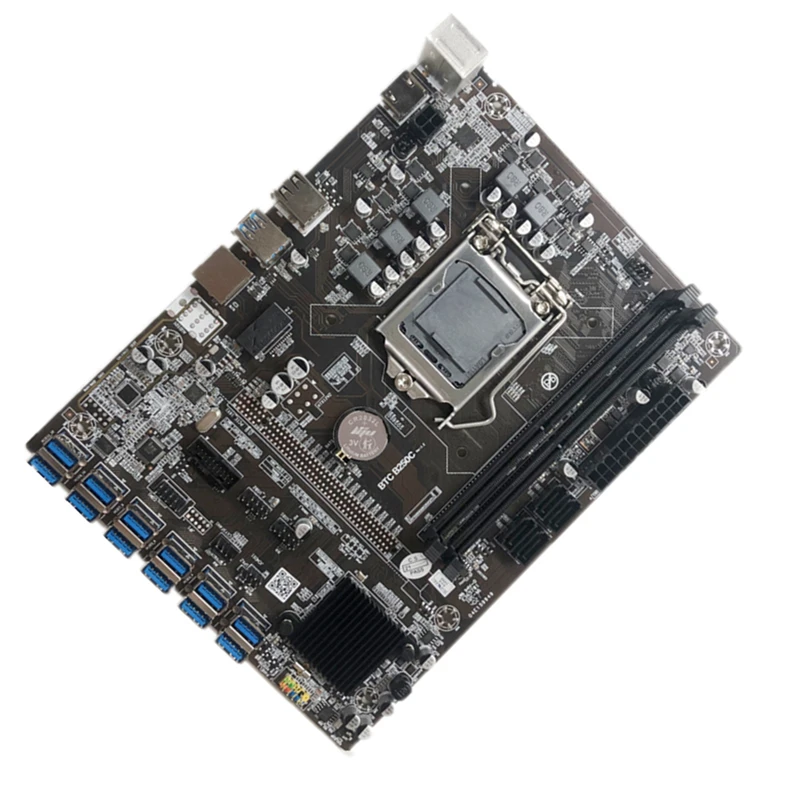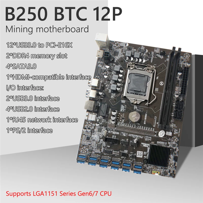 B250C BTC 12xusb настольный компьютер Майнинг машина материнская плата PCI Express графическая карта DDR4 CPU Майнинг плата поддерживает LGA1151 серии Gen6/7 HDMI-СовместимостьОсобенность:1. Инновационный дизайн, преобразование PCIE 1x напрямую в интерфейс USB3.0, уменьшение промежуточных каналов передачи, снижение затрат, уменьшение затухания сигнала и обеспечение стабильной непрерывной долгосрочной работы;2. Обновите интерфейс дисплея высокой четкости, совместимый с HDMI, что удобно и практично;3. Поддержка процессоров Core 6-го и 7-го поколений, простота в использовании LGA1151, низкая стоимость, Низкие инвестиции и эффективное добыча полезных ископаемых;4. Этот продукт изготовлен из высококачественных материалов, прочный, с длительным сроком службы, прочный и стабильный в использовании.Спецификация:Модель продукта: B250 BTC 12PПроцессор: поддерживает все процессоры серии LGA 1151Чипсет: с использованием высокоскоростного чипсета IntelB250Память: 2 * слота памяти DDR4DIMM, поддержка памяти 2133/2400 МГц, максимальная поддержка 16 ГбЧип дисплея: встроенная видеокарта Intel HD Graphics coreВыход Дисплея: совместим с HDMI/12 * USB3.0 до PCI-E16XСеть: 1 * RTL8111F гигабитный чип EthernetХранение: 4 интерфейса жесткого диска SATA