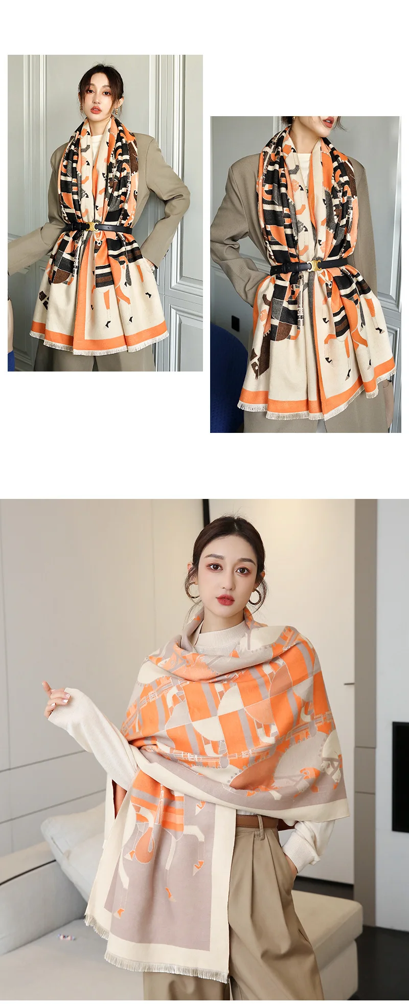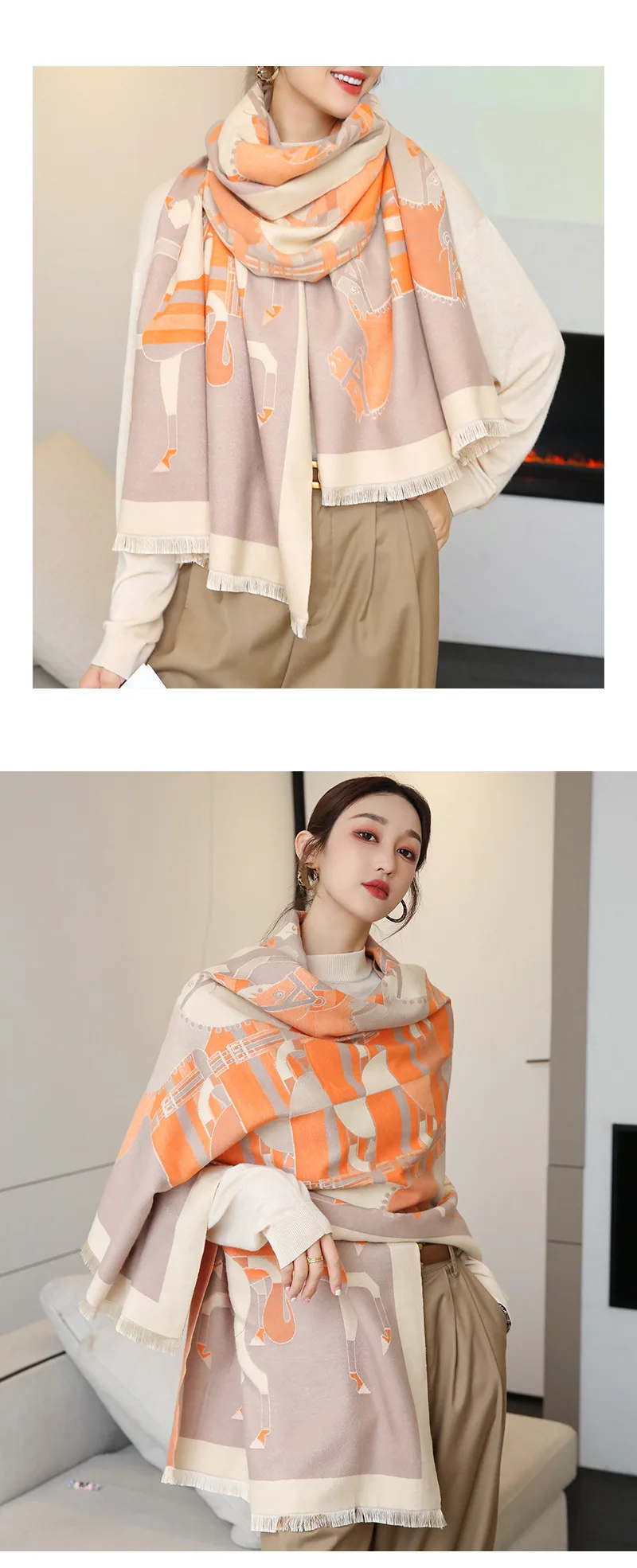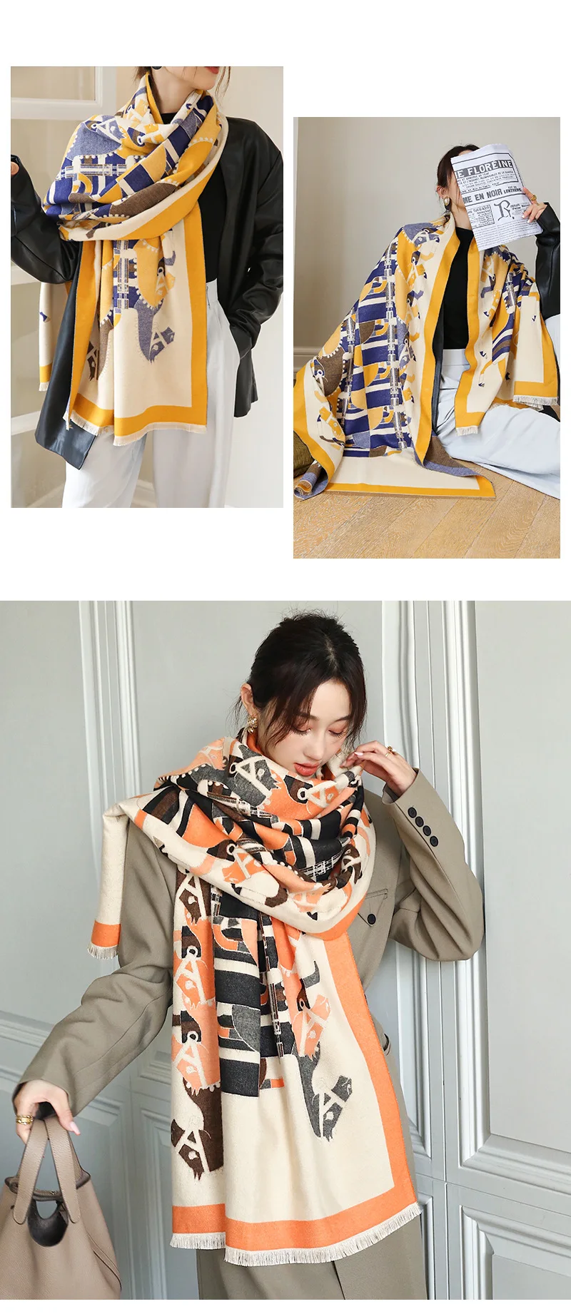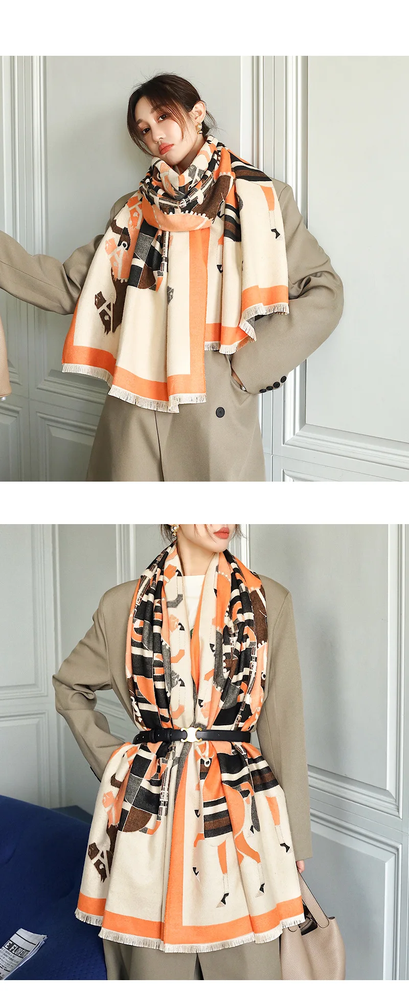 Шарф женский кашемировый, зимний, толстый, с принтом лошадей