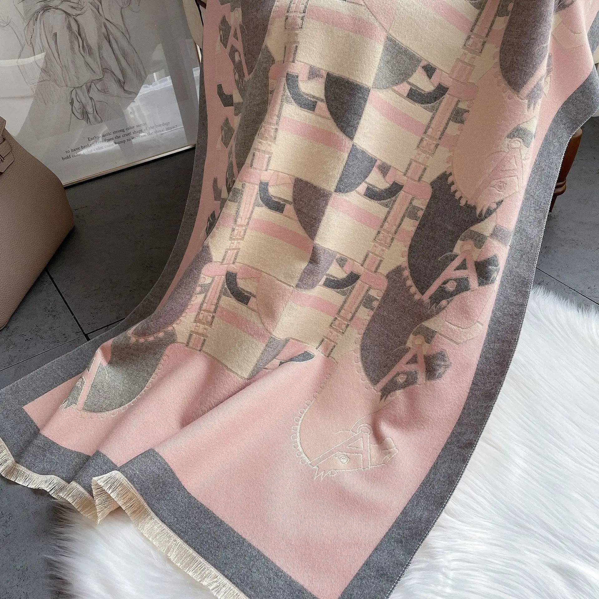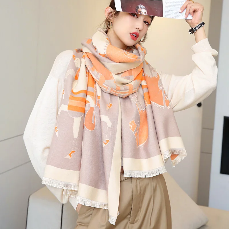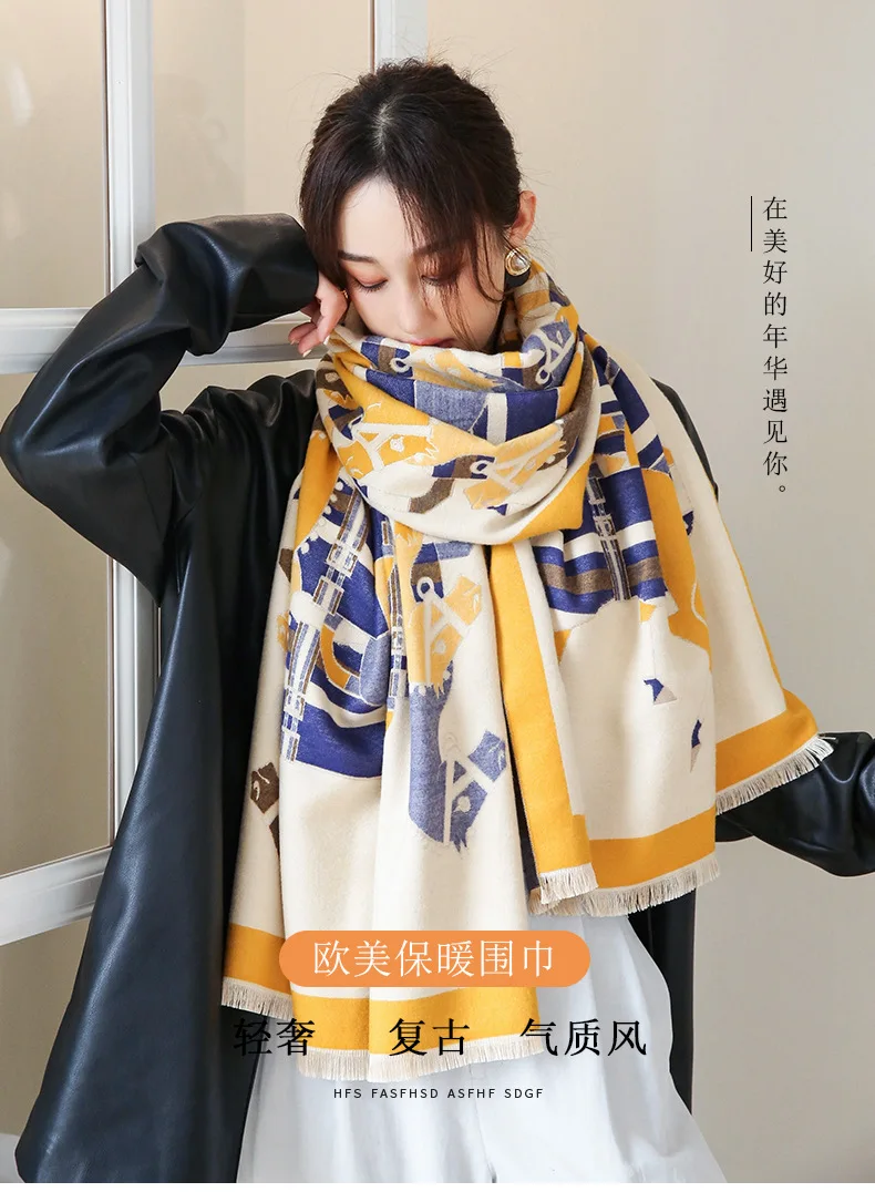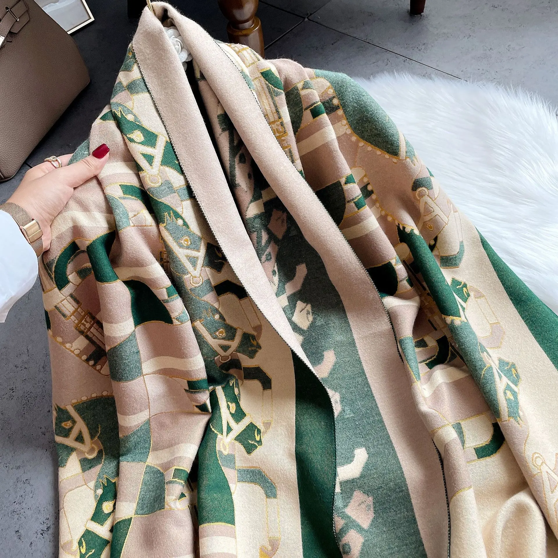 Шарф женский кашемировый, зимний, толстый, с принтом лошадей