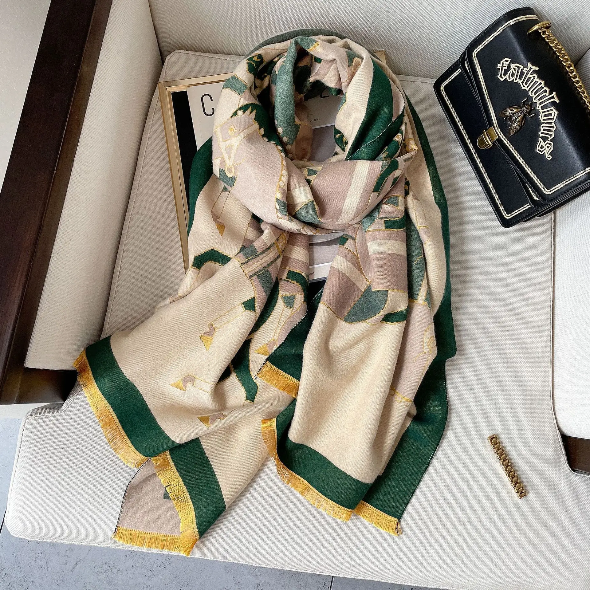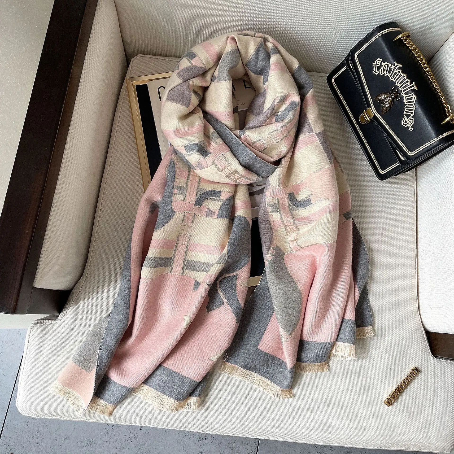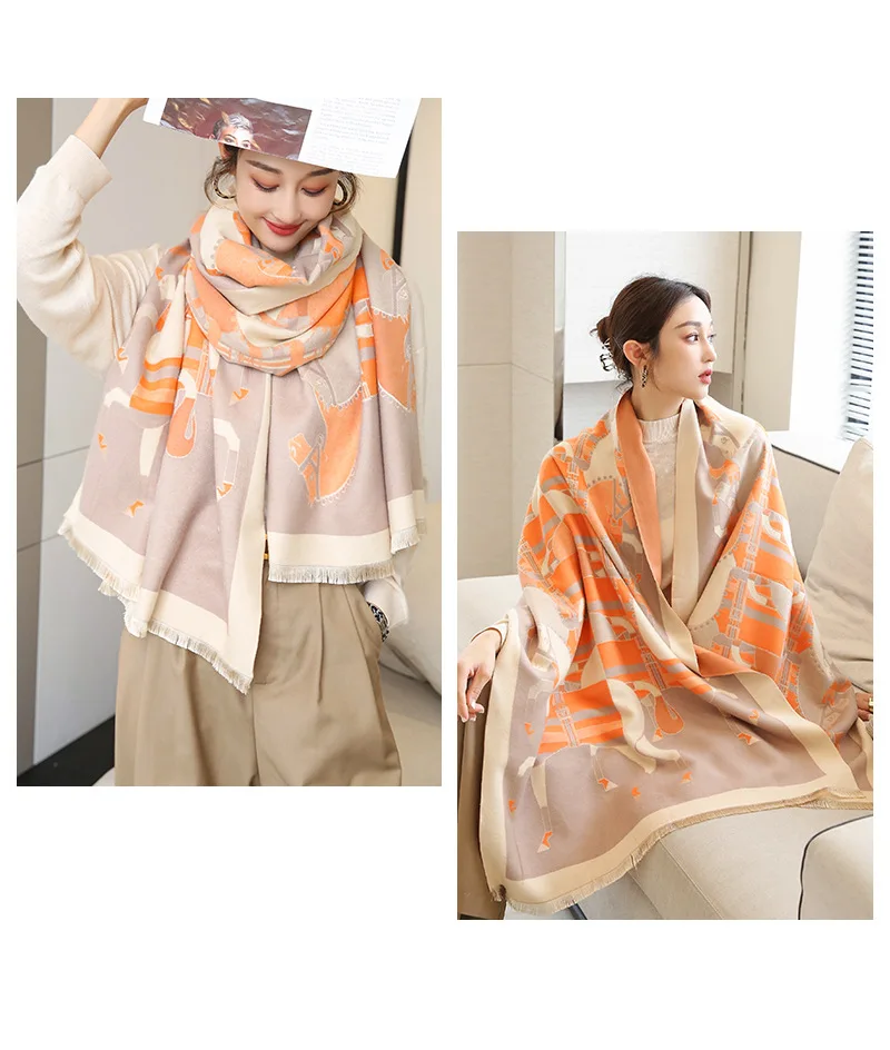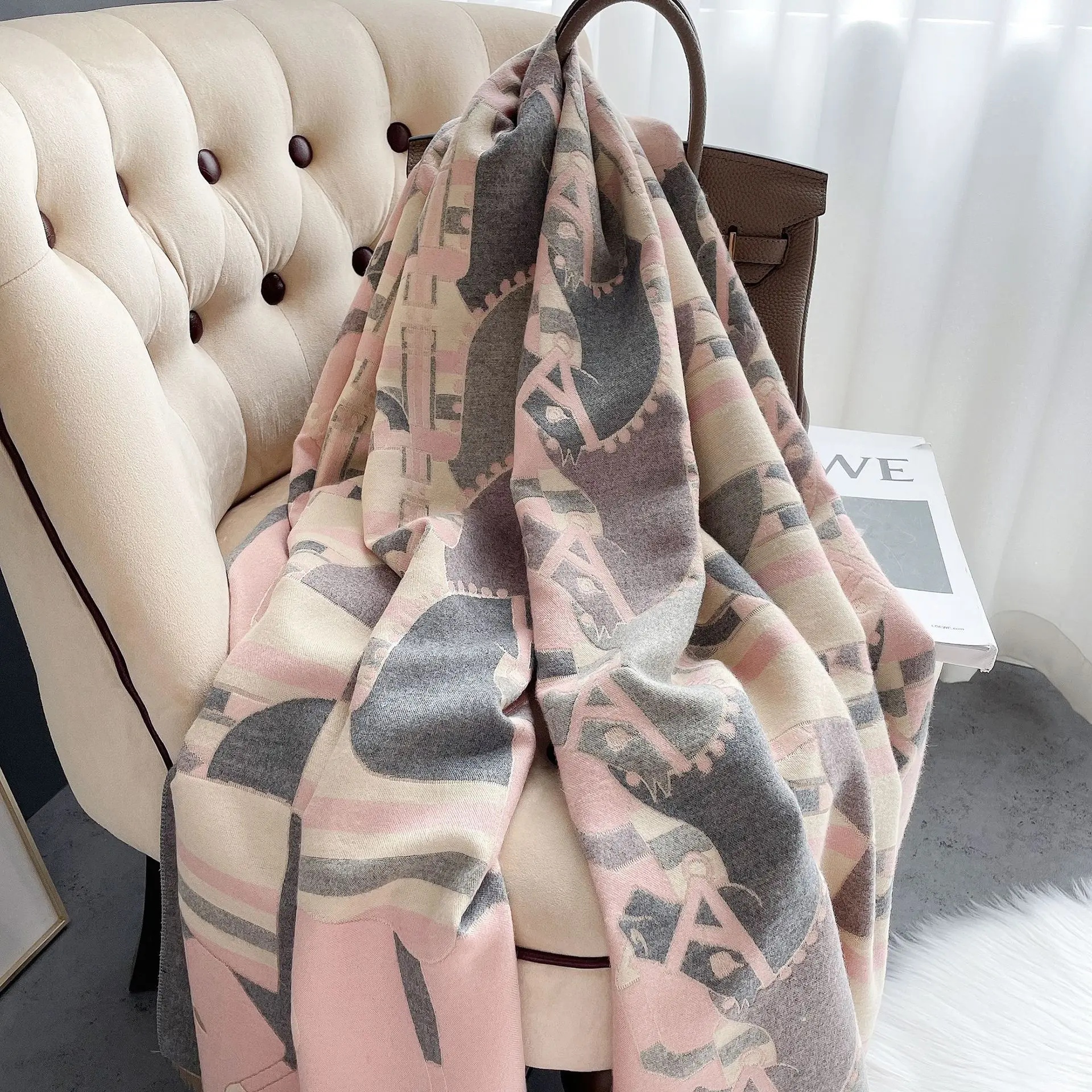 Шарф женский кашемировый, зимний, толстый, с принтом лошадей
