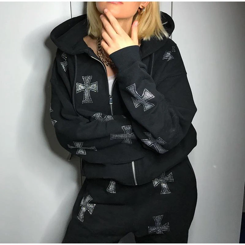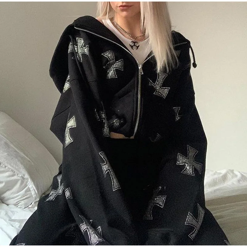 Стразы Готическая уличная одежда с длинным рукавом черная толстовка на молнии Y2k Джоггеры в стиле хип-хоп Свитшот корейская мода в стиле панк спортивное пальто пуловер