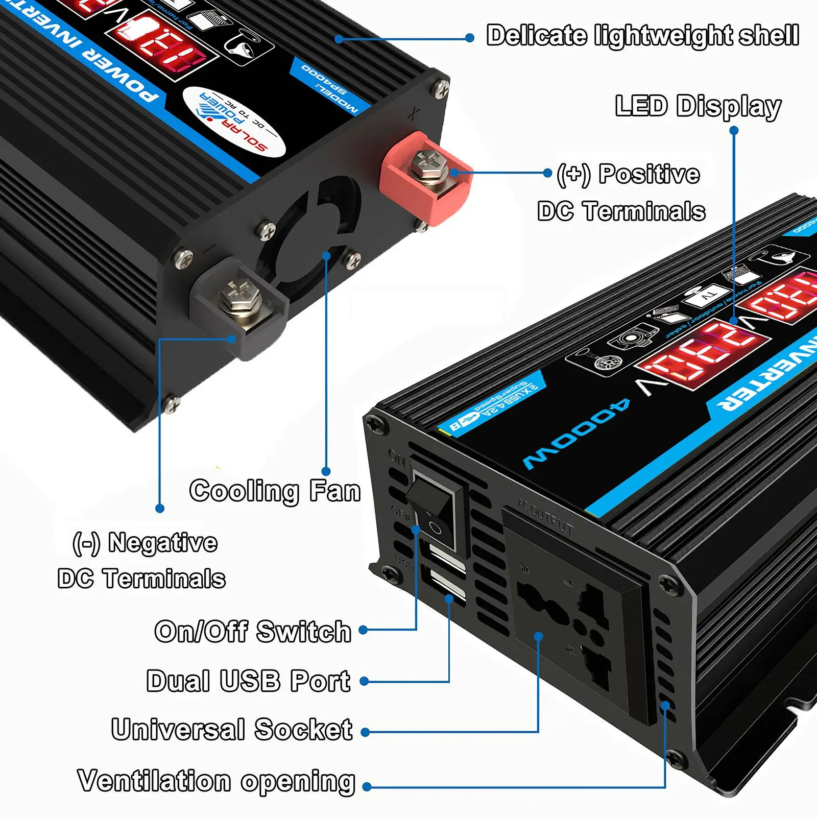 Автомобильный преобразователь напряжения, 12-220 В, 4000 Вт, с двумя USB-портами и дисплеем напряжения