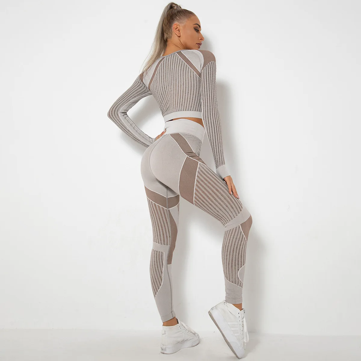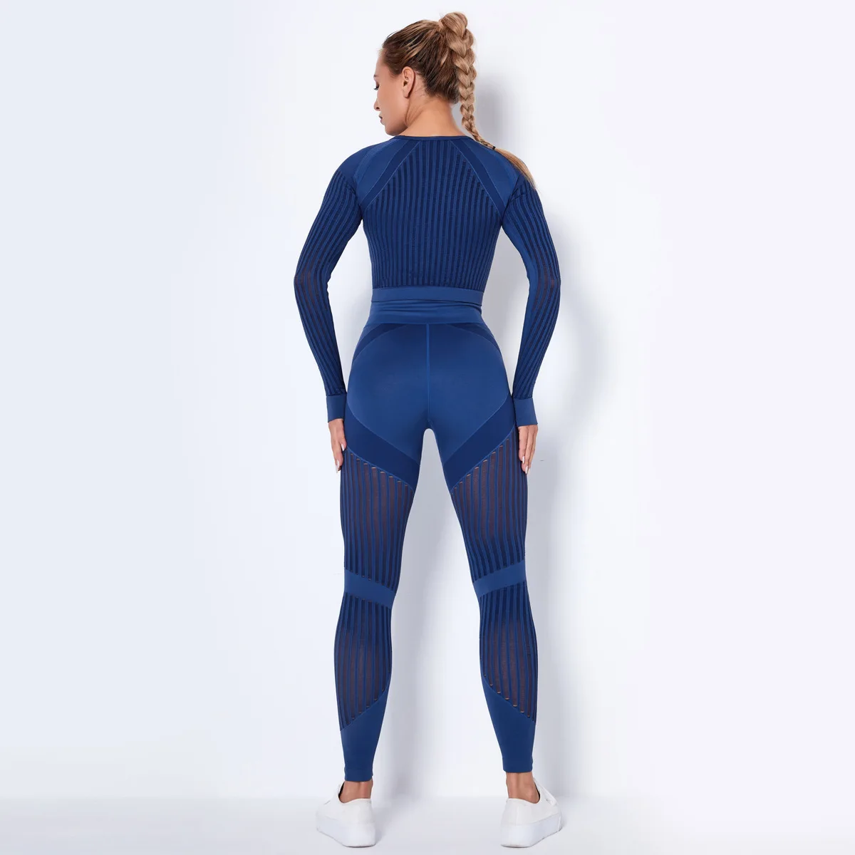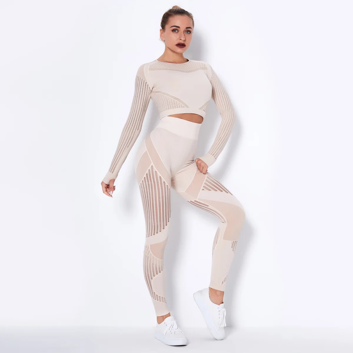Ажурный бесшовный комплект для йоги, спортивные наряды, женская рубашка с длинным рукавом, 2 предмета, короткий топ, леггинсы, тренировочный костюм, спортивные комплекты для фитнеса