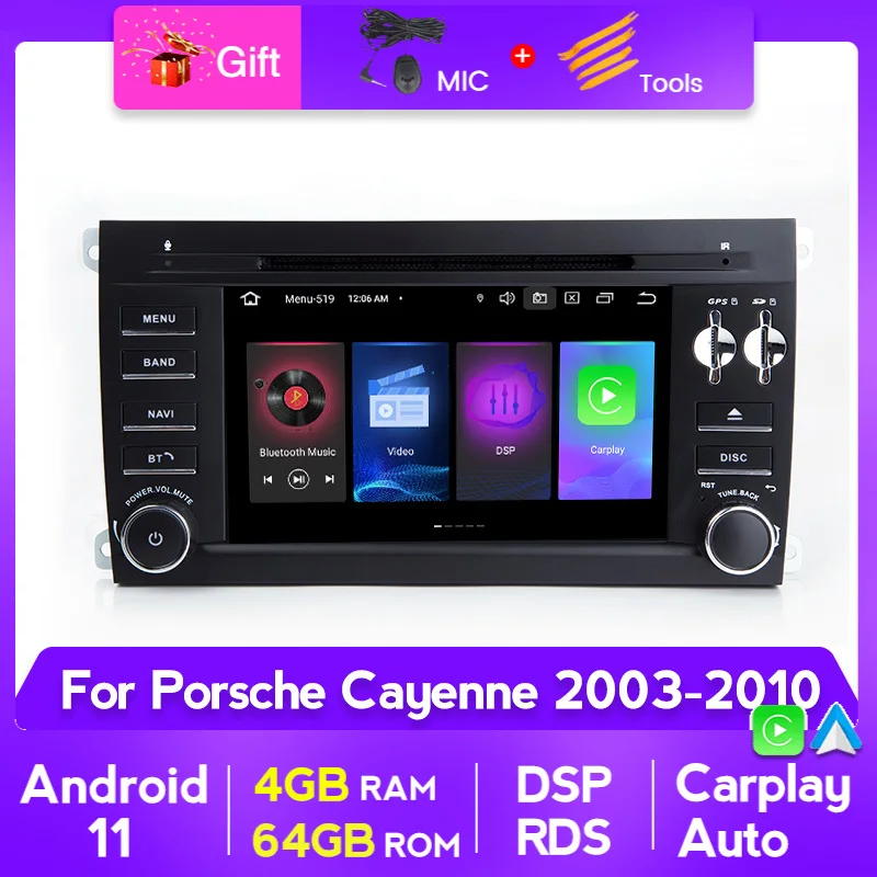 > Автомобильный мультимедийный плеер Подходит для: Для Porsche Cayenne 2003- 2010 Новая версия Android 11 Радио IC 7708, усилитель мощности IC 7388, встроенный WIFI Встроенный беспроводной carplay + проводной автоматический DSP RDS