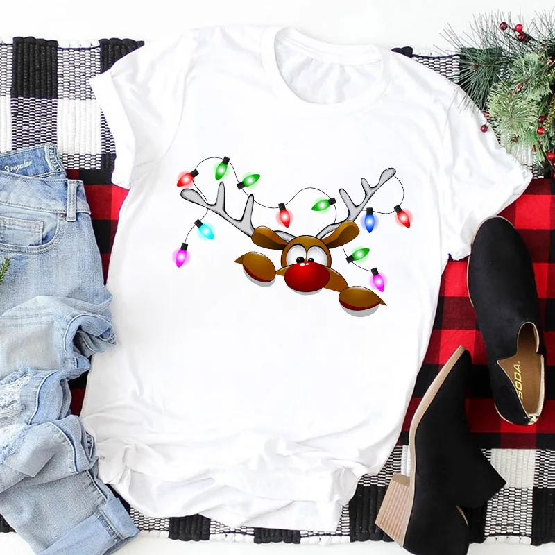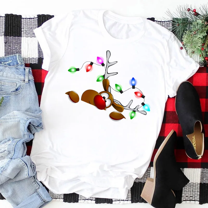 Милая одежда с забавным мультяшным рисунком Санта-Клауса и лося, Рождественская футболка для женщин, женская футболка с принтом, топ, графическая женская футболка