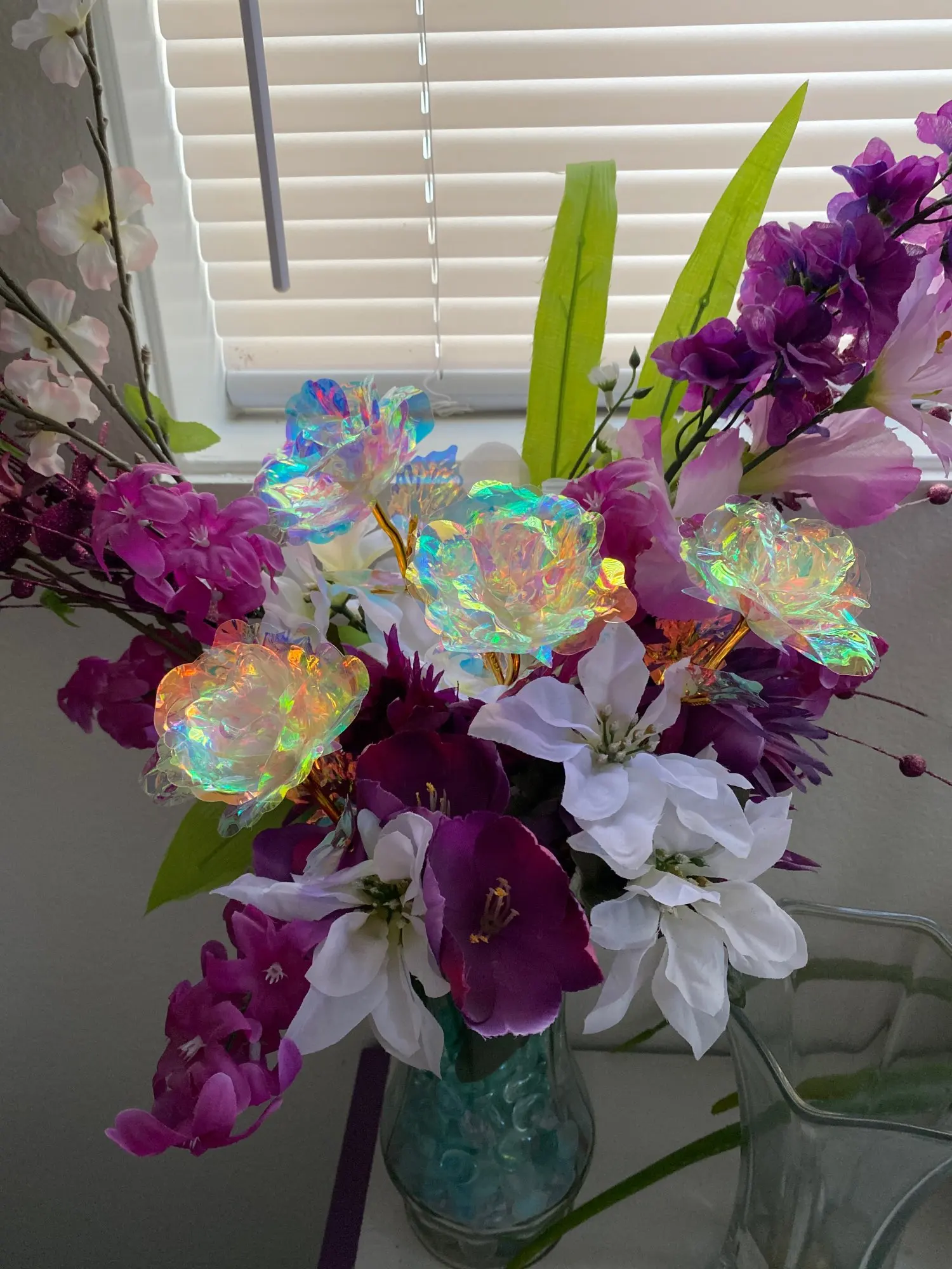 Розы красивые, без подсветки. Это плотный блестящий целлофан на пластиковой ножке. Поставщик упаковывает в картонку, обмотанную плёнкой и часть лепестков и листиков помято, как разгладить, не знаю. Ну так, милый знак внимания сотрудницам на 8-е марта. По описанию мне было не понятно, насколько тонкие листья и лепестки и что там совсем тонкий пластик. с другой стороны плотный пластик ломался бы при доставке. Доставка очень быстрая, с продавцом не общалась.