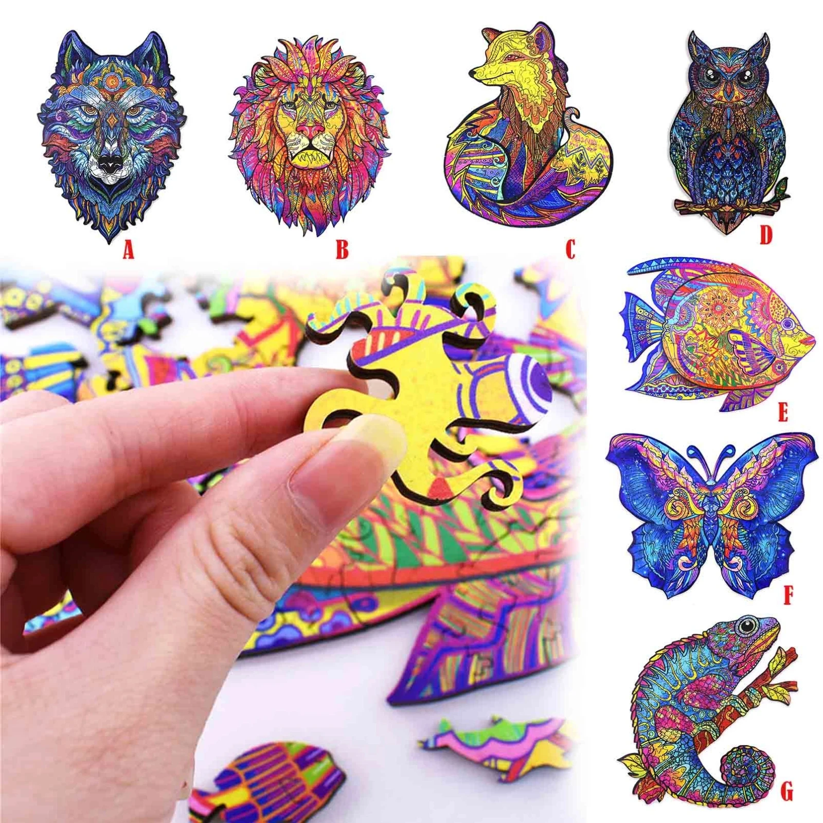 Материал: ДеревянныйМодель: животные деревянные головоломкиТолщина: около 5 ммЖивотные: лев, волк, рыба, слон, Бабочка, лисаУпаковка: цветная коробка