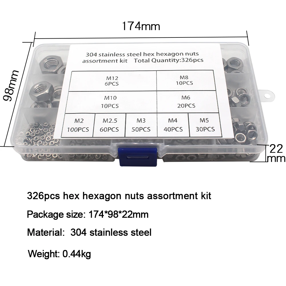 Набор метрических шестигранных гаек из нержавеющей стали 326, 304 шт., DIN934 M2 M2, 5 M3 M4 M5 M6 M8 M10 M12 дюйма, Набор шестигранных гаек