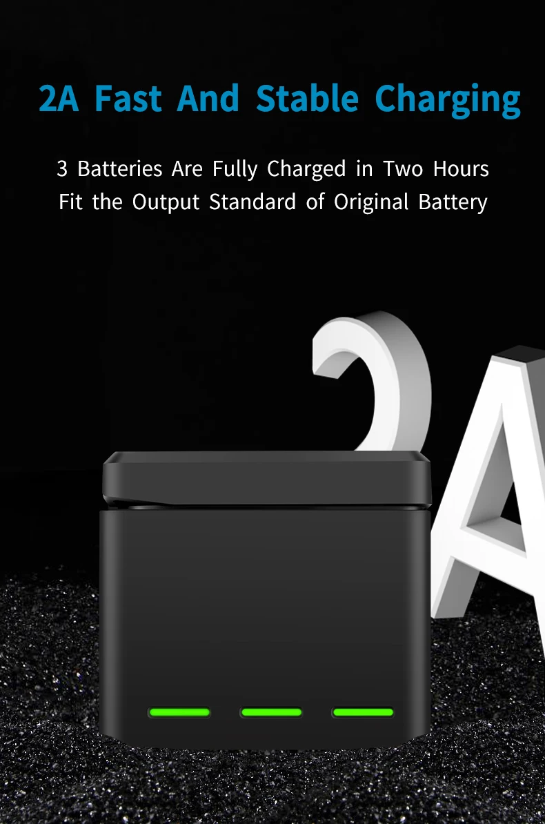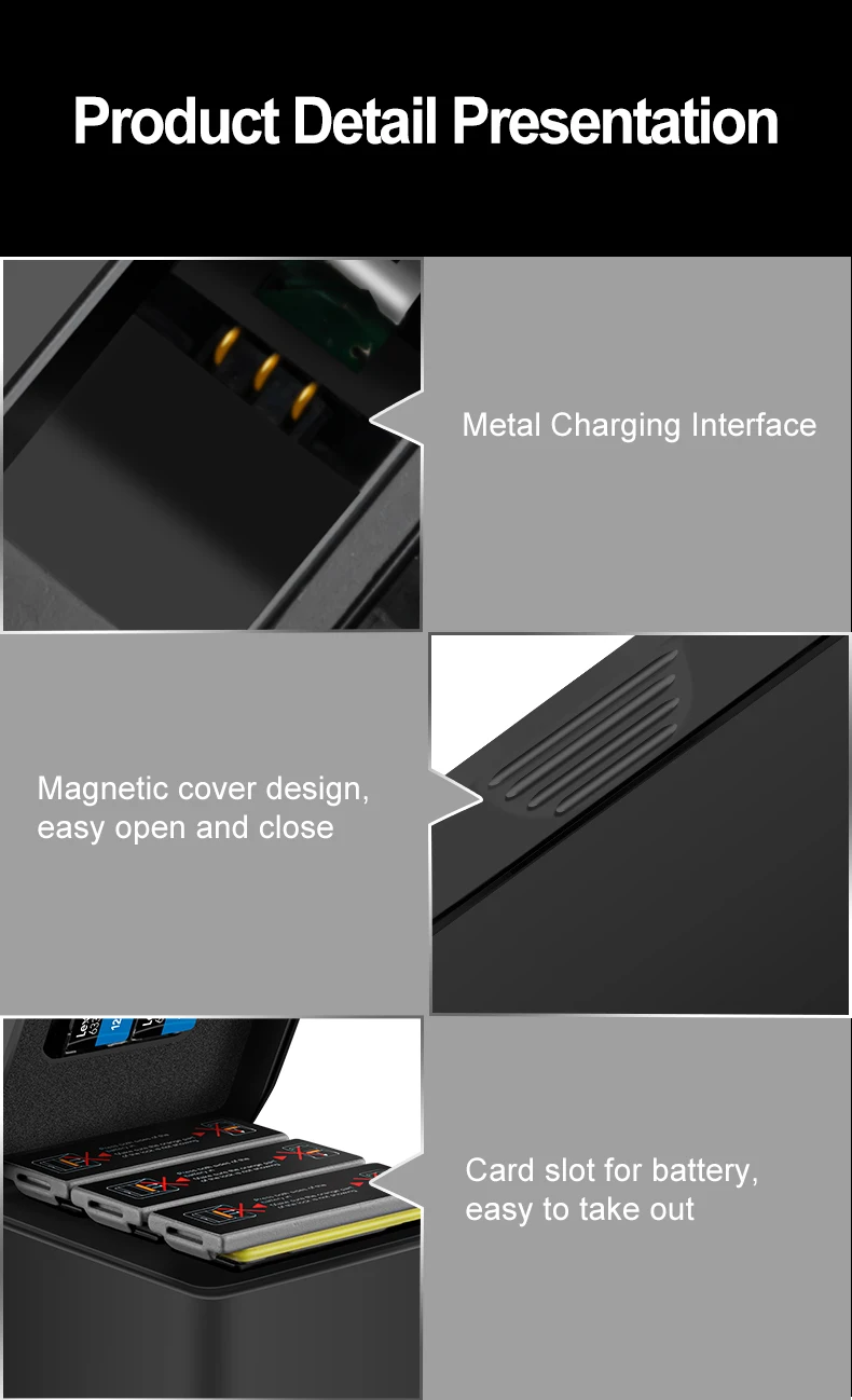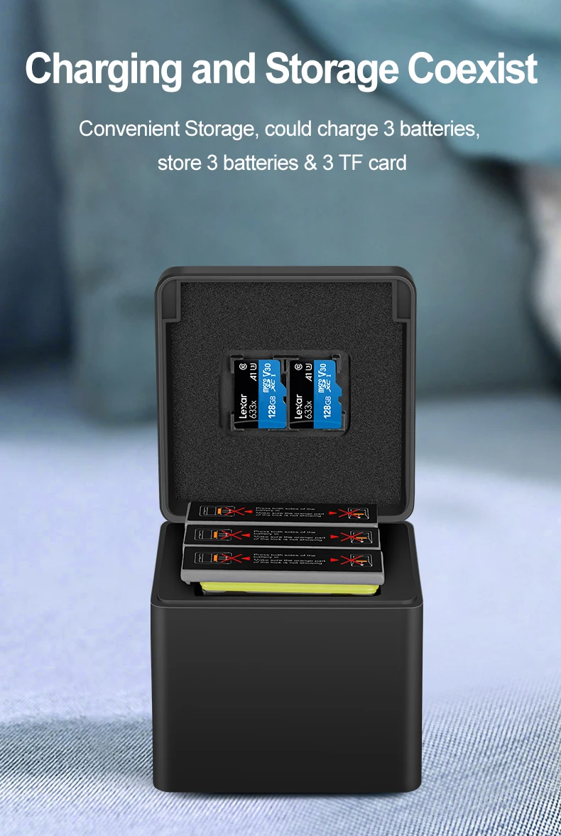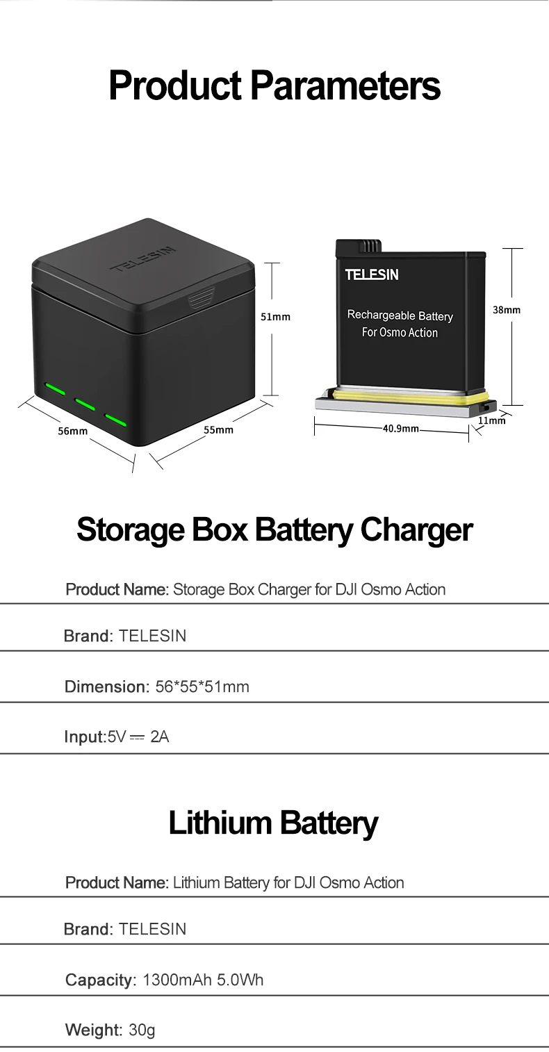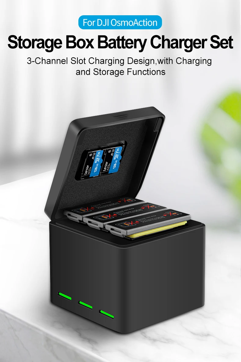1. Зарядное устройство Mini USB 3 слота может одновременно заряжать до 3 батарей.2. Может хранить 3 батареи и 2 tf-карты3. Изготовлен из высококачественной меди для обеспечения высокой производительности и стабильности.4. Сильная Совместимость: работает с аккумулятором TELESIN и оригинальным аккумулятором osmo action.5. Зарядное устройство может питаться от настенного зарядного устройства, внешнего аккумулятора или вашего ПК, ноутбука, бортовой подзарядки и т. д.6. Магнитное открывание и закрытие крышки7. 100% Безопасная защита печатной платы8. Светодиодный индикатор зарядного устройства: Красный светильник заряжается, зеленый светильник полностью заряжен.