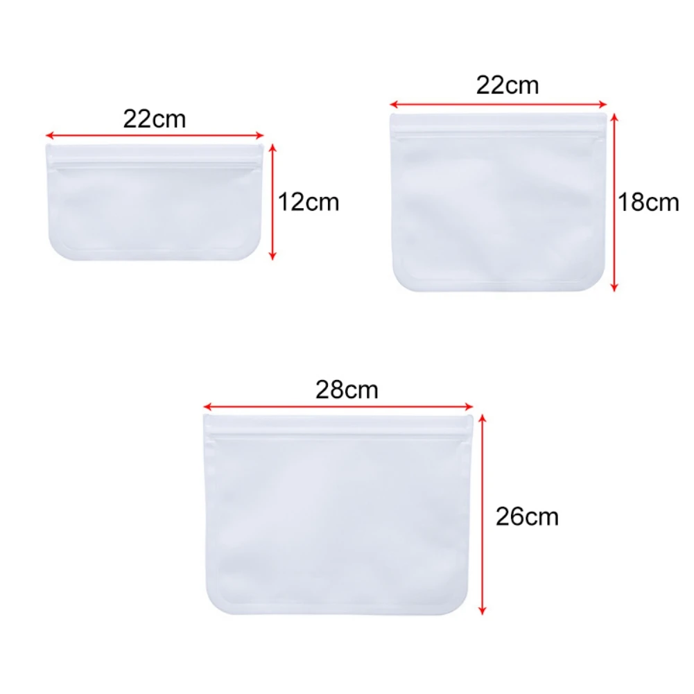 1. Упаковка и хранение пищевых продуктов в холодильнике.2. Прозрачный дизайн, вы можете быстро просмотреть содержимое в нем. Многоразовые ламинированные пакеты утолщены, и сотни раз можно использовать повторно, что является идеальным решением для уменьшения отходов пластиковых пакетов.3. Пакеты для пищевых продуктов используют усовершенствованные методы двойного запечатывания на молнии, более герметичные, герметичные и гигиеничные. Запечатанный и сохраняющий свежую здоровую еду и помещайте ваши товары в толстый защитный мешок для путешествий.Материал: PEVAРазмер: 26*28; 22*18 ; 22*12.