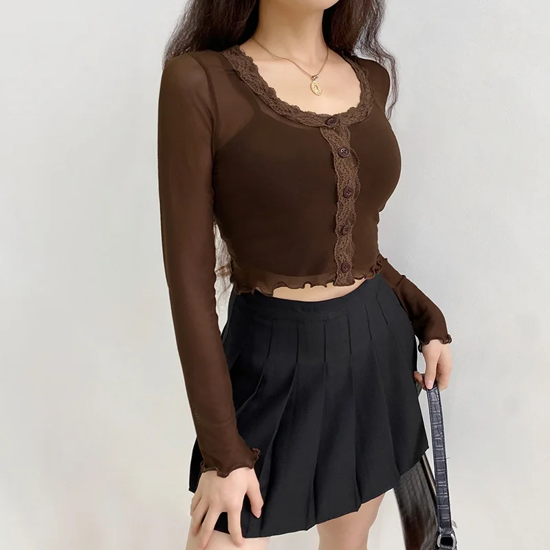Y2K EGIRL Винтаж оборки сетка коричневые футболки 90s в уличном сти...