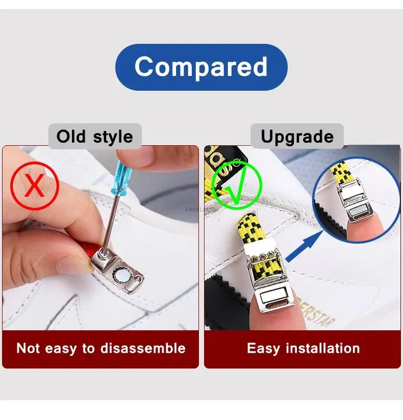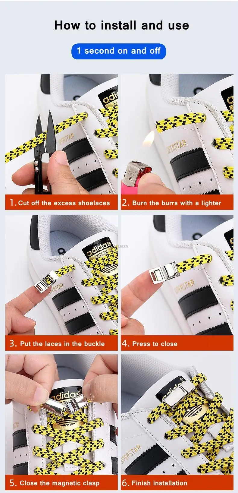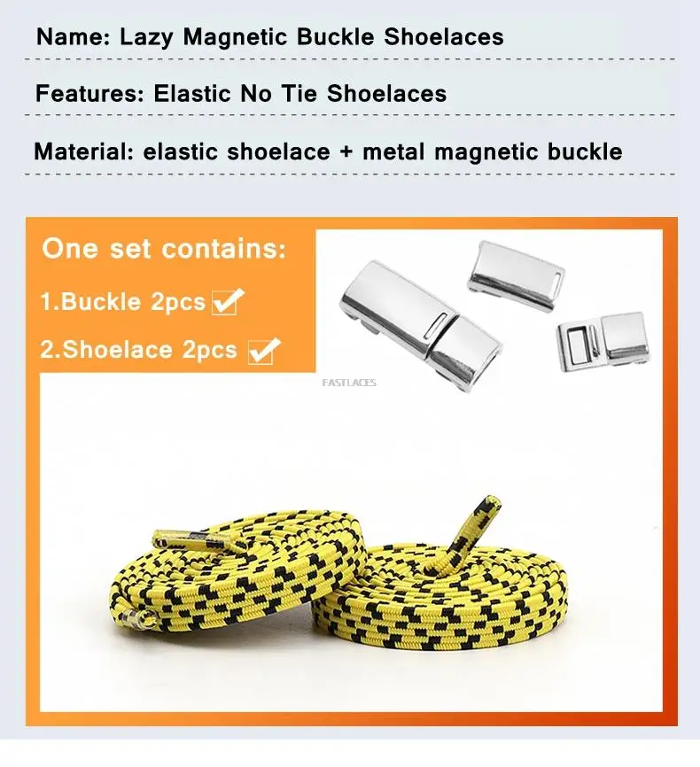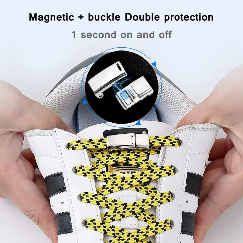 Научный дизайн: усовершенствованная версия шнурков без завязок имеет уникальную изогнутую магнитную пряжку и плоскую эластичную веревку. Магнитный и защелкивающийся двойной замок позволяет вам никогда не беспокоиться, что ваши шнурки будут ослаблены; кружевные замочки изогнуты и оснащены плоским эластичным шнуром, который идеально сочетается с вашими ногами, чтобы Вашим ногам было комфортно в течение всего дня.