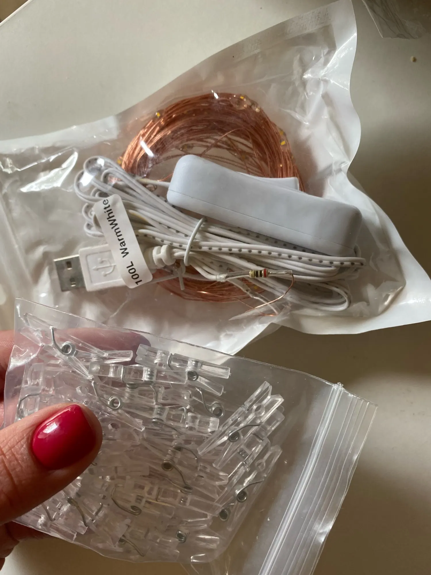 Гирлянда сама по себе красивая, с медным оттенком и работает. Немного разочаровали прищепки. Некоторые рассыпаются прямо в руках, когда их пытаешься закрепить. Советую купить простую такую гирлянду, а прищепки купить отдельно в канцелярском магазине по качественее.