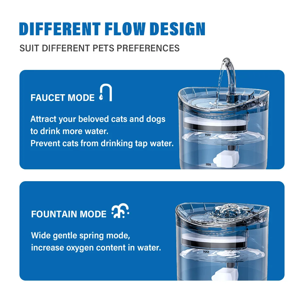Режим фонтана-Широкий деликатный пружинный режим, повышает содержание кислорода в воде.Режим крана-Струйка, похожая на кран, привлекает ваших любимых кошек и собак, чтобы пить больше воды. Предотвращает попадание котов в питьевую воду.