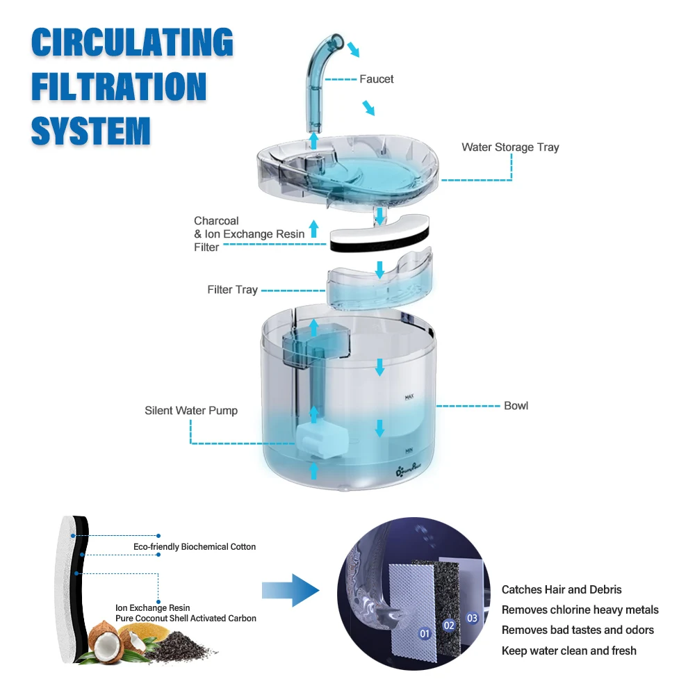 -Четырехкратная система фильтрации обеспечивает здоровую и свежую воду для вашего питомца.-3 слоя фильтра: губка может застать кошки волосы и мусор, ионообменная Смола слой может смягчить воду из-под крана, третий активированный уголь слои могут для устранения неприятного вкуса и запаха.