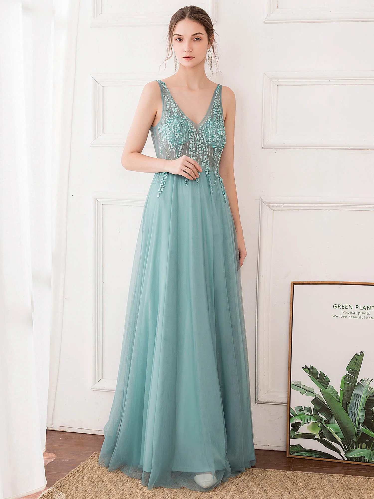 Женское платье в пол без рукавов с блестками и V-образным вырезом