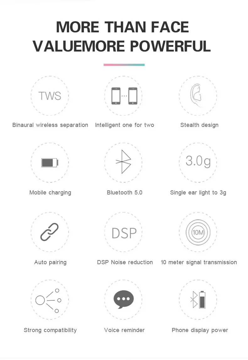 Параметры:1. Диапазон передачи Bluetooth: 10 метров2. Емкость аккумулятора: 300 мАч3. Емкость аккумулятора для наушников: 40 мА · ч4. Время работы: около 2-5 часов5. Время зарядки: около 1-2 часов6. Время работы в режиме ожидания: около 150 часов7. Материал: пластик8. Водонепроницаемость: IPX49. Режим работы: кнопки10. Совместимость: Android, iOS, Microsoft, планшет, 99% телефонов с Bluetooth.Особенности:1. Полностью Частотный HIFI подвижный Утюг2. Дисплей питания в реальном времени, уровень мощности с первого взгляда3. Левый и правый уши могут использоваться отдельно и могут быть независимо совместимы с bluetooth-устройствами4. Дизайн умных кнопок, прост в эксплуатации5. Bluetooth 5,0, низкое энергопотреблениеПримечание:При покупке bluetooth-гарнитуры tws, пожалуйста, прочитайте следующие инструкции: из-за длительной транспортировки мощность наушников tws будет истощена. Вы не сможете использовать гарнитуру, когда получите посылка. Он может быть выключен. Первое, что нужно сделать, это зарядить гарнитуру в течение 30 минут. Очень важно. Спасибо!У этого продукта Нет коробки для розничной упаковки!Упаковочный лист:1 * bluetooth-гарнитура1 * зарядное устройство1 * кабель для передачи данных1 * Руководство пользователя