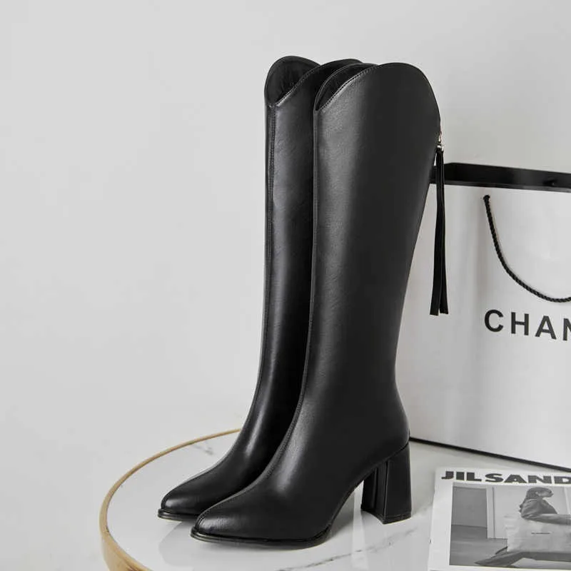 Женские сапоги до колена с плюшевой подкладкой, черные кожаные боев...