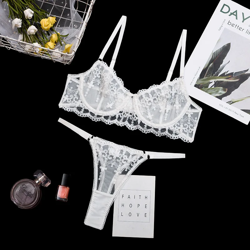 Женское нижнее белье с вышивкой, тонкий прозрачный кружевной бюстгальтер пуш-ап и трусики, комплект из 2 предметов, Эротическое нижнее белье