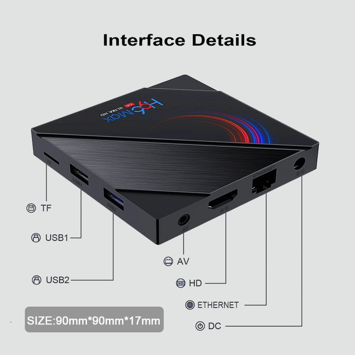 * Процессор: H616 четырехъядерный cortex-A53* GPU: G31MP2 поддерживает OpenGL ES 3,2/2,0/1,0, Vulkan 1,1, OpenCL 2,0* O.S: Android 10,0 новейшая Android телеприставка, более стабильная, безопасная и более Энергоэффективная* Память: RAM 4G ROM 32G/64G* Беспроводной: 2,4G и 5,8G Wifi* USB: 2 типа A USB2.0* Поддержка Bluetooth: BT4.0* LAN Ethernet:10/100 м Стандартный RJ-45* HDMI-Совместимость: HDMI 2.0a до 4K @ 60fps* 3D: жесткое 3D Графическое ускорение* Поддержка формата декодера:-Профиль VP9 2 до 4K x 2K @ 60fps-H.265 Main10@L5.1 до 4K x 2K @ 60fps, или 6K @ 30fps-AVS2-P2 профиль до 4K x 2K @ 60fps-H.264 BP/MP/HP@L4.2 до 4K x 2K @ 30 кадров в секунду-H.263 BP до 1080P @ 60fps-MPEG-4 SP/ASP @ L5 до 1080P @ 60fps (ISO-14496)-MPEG-2 MP/HL до 1080P @ 60fps (ISO-13818)-MPEG-1 MP/HL до 1080P @ 60fps (ISO-11172)-Xvid до 1080P @ 60 кадров в секунду-Sorenson Spark до 1080P @ 60fps-VP8 до 1080P @ 60 кадров в секунду-AVS/AVS + JiZhun профиль до 1080P @ 60fps-WMV9/VC1 SP/MP/AP до 1080P @ 60fps-Формат файла JPEG HFIF до 45MPPS* Мышь/Клавиатура: Поддержка Мышь и клавиатуры через USB; Поддержка 2,4 ГГц беспроводной Мышь и клавиатура через 2,4 ГГц USB донгл* Язык: английский, русский, французский, немецкий, испанский, итальянский и т. Д.* Есть три варианта коробки H96 MAX H616:2 ГБ 16 ГБ Android 10,0 4k @ 60 Гц 2,4G и 5,8G Wifi4 ГБ 32 ГБ Android 10,0 4k @ 60 Гц 2,4G и 5,8G Wifi4 ГБ 64 ГБ Android 10,0 4k @ 60 Гц 2,4G и 5,8G Wifi
