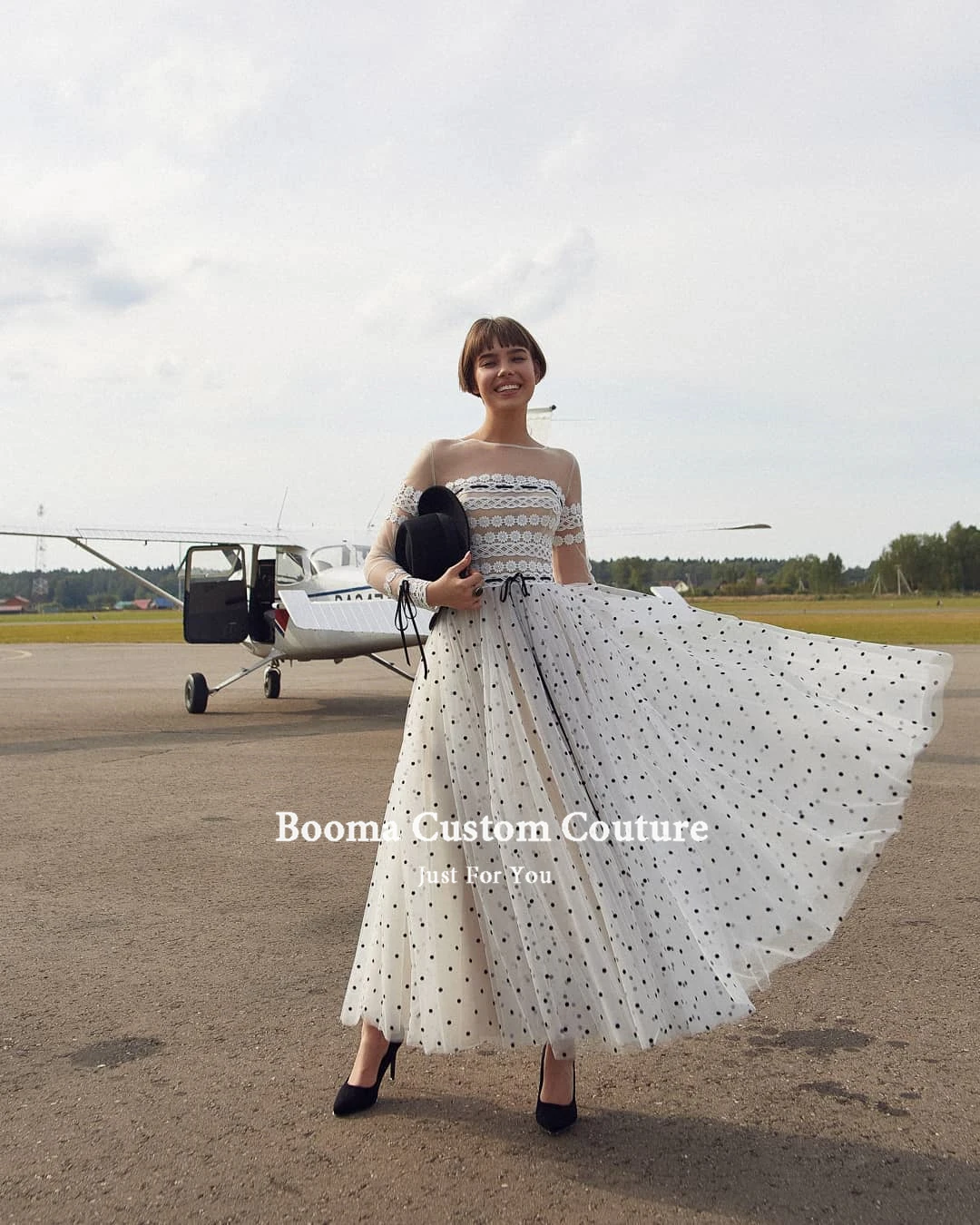 Платье-миди из тюля в горошек, с длинным рукавом, с лентами
