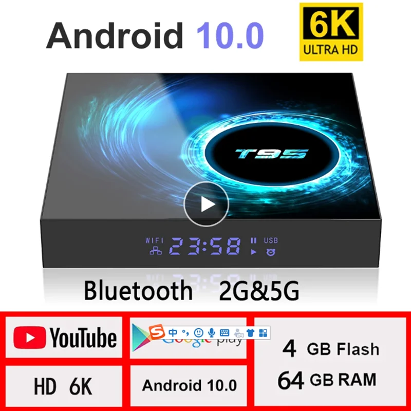 Приставка Смарт-ТВ T95 на Android 2020, 4 + 6410,0 ГБ, 128 ГГц, Wi-Fi, 2 + 16 Гб