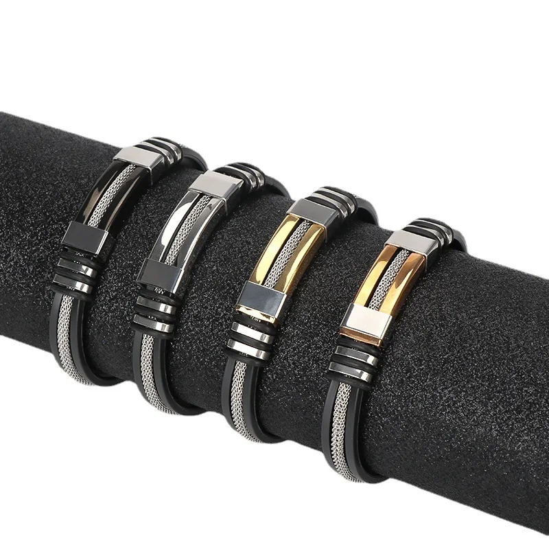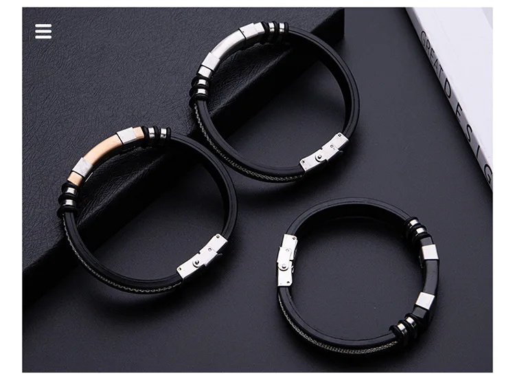 Браслет мужской кожаный, многослойный, черный, из нержавеющей стали