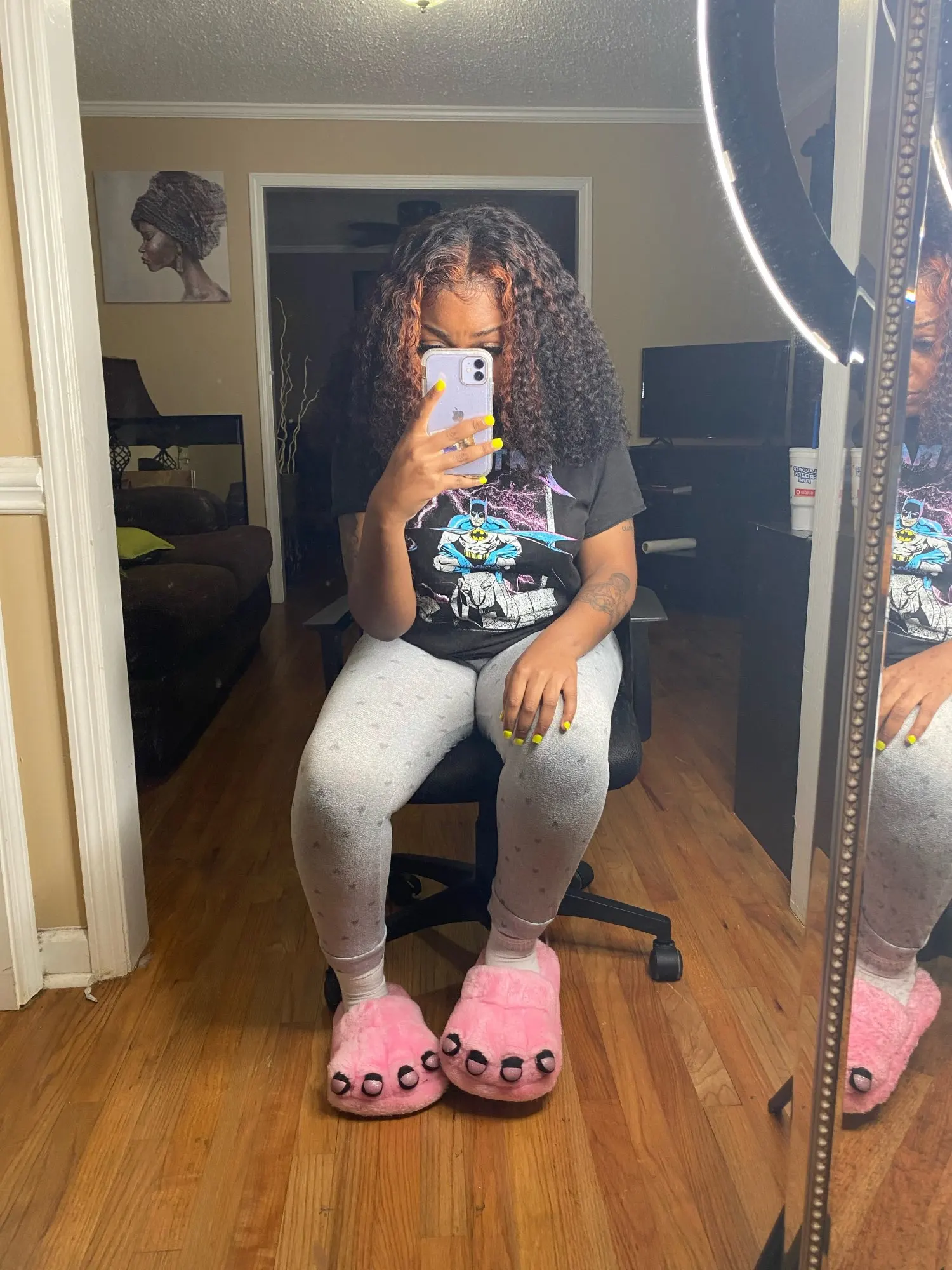 Люблю этот кудрявый парик, я получаю так много комплиментов. Он очень полный и мягкий. При использовании кисти denman локоны становятся еще больше бомб. Я был не уверен, так как это парик с Т-образным ремешком и его можно носить только посередине, но он того стоит. Заполните точно, но снова от этой компании. Действительно легкая работа с волосами, была сделана безупречная установка на себя.