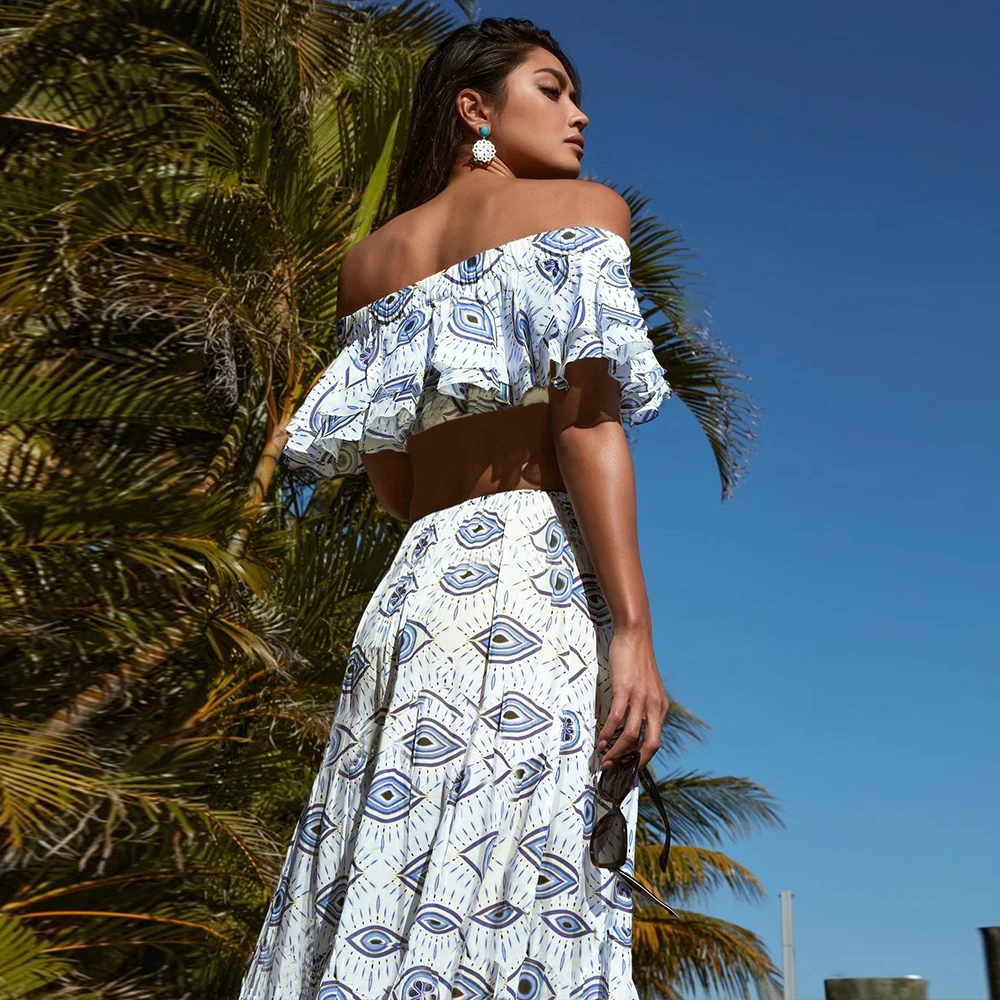 Женское пляжное платье с принтом глаза, длинное белое платье-бандо с юбкой, праздничное платье макси, летняя одежда, новинка 2021