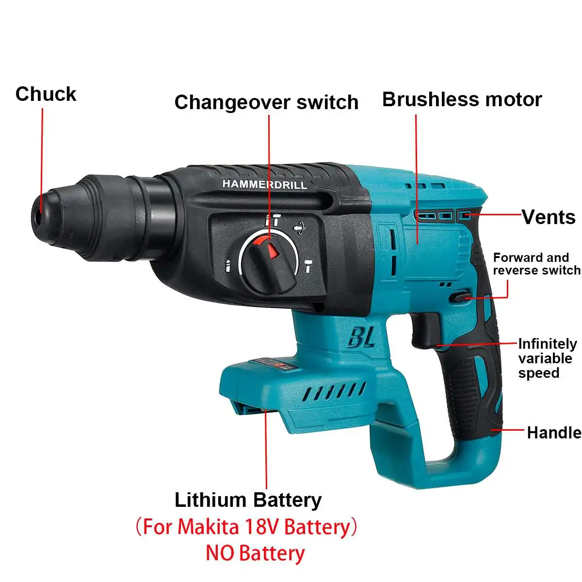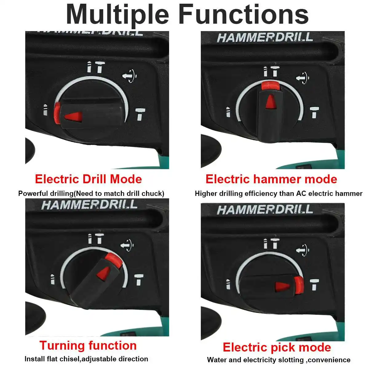 Несколько функций:-Режим электрической дрели:Мощное сверление (необходимо подобрать сверлильный патрон)-Режим электрического молотка:Более высокая эффективность бурения, чем электрический молоток переменного тока-Функция поворота:Установка плоского зубила, Регулируемое направление-Электрический режим выбора:Долота воды и электричества, удобная