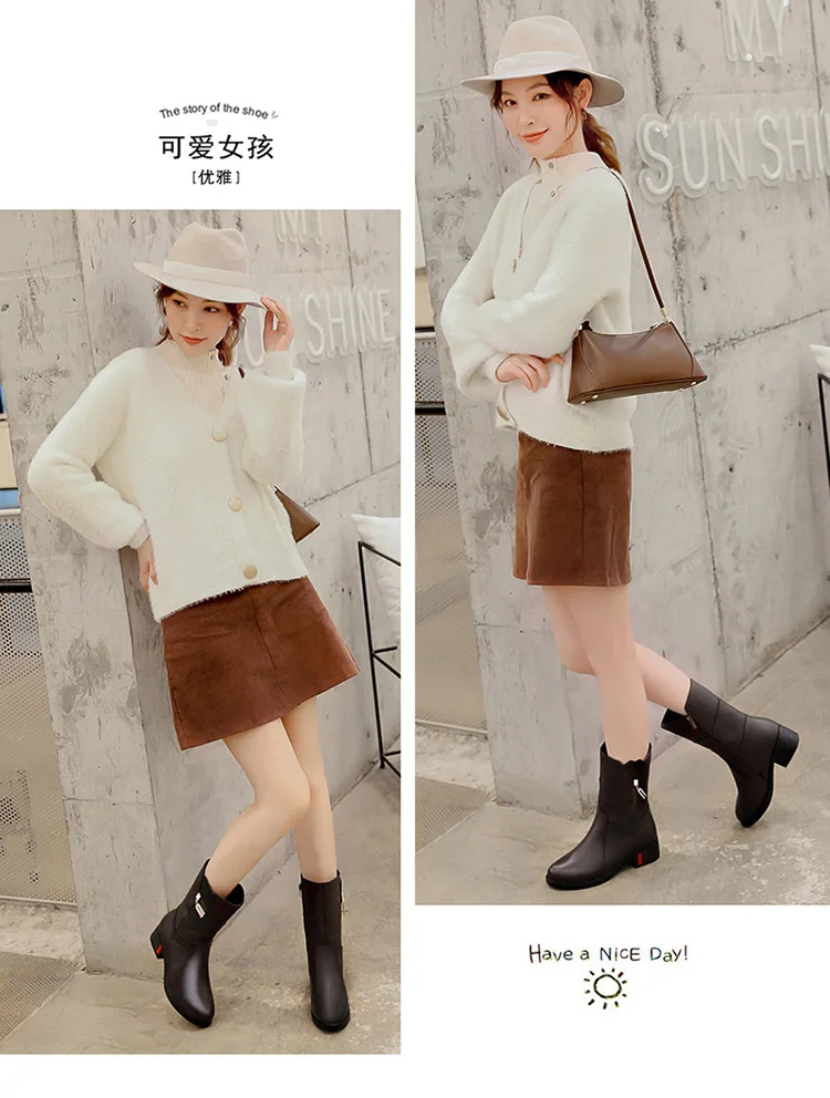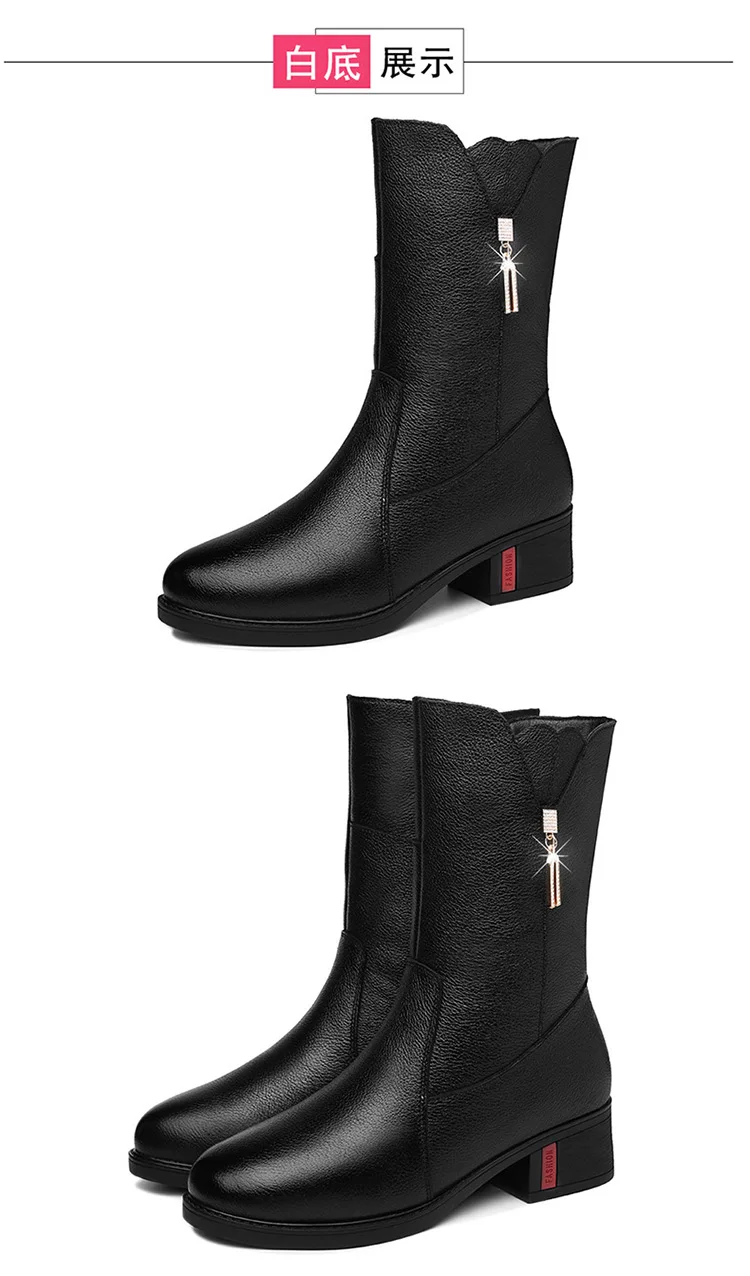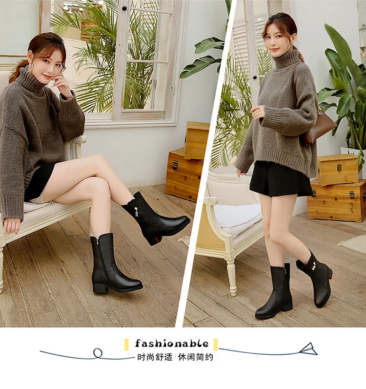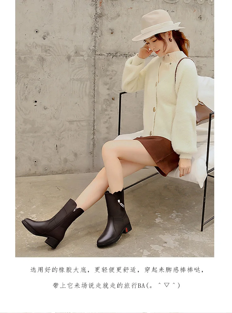 Женские ботильоны из натуральной кожи, до середины икры, на толстом каблуке
