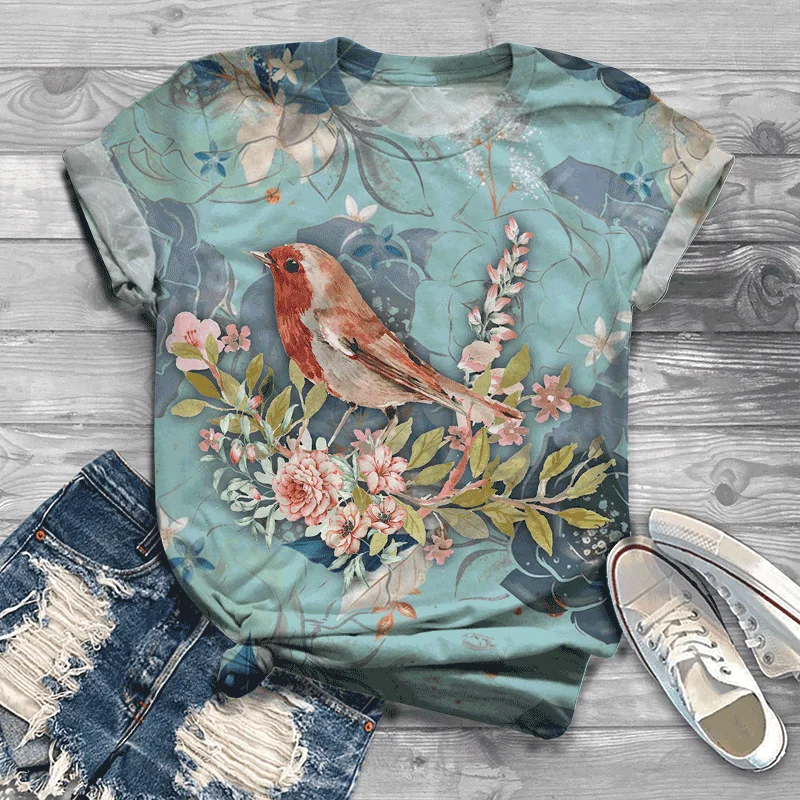 Летние красивые футболки с коротким рукавом и принтом птиц, оригинальная женская футболка, топы в разных стилях, футболка, корейская модная одежда