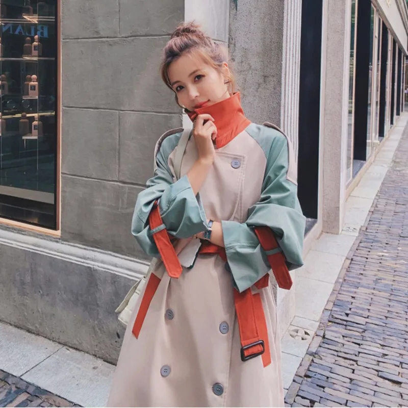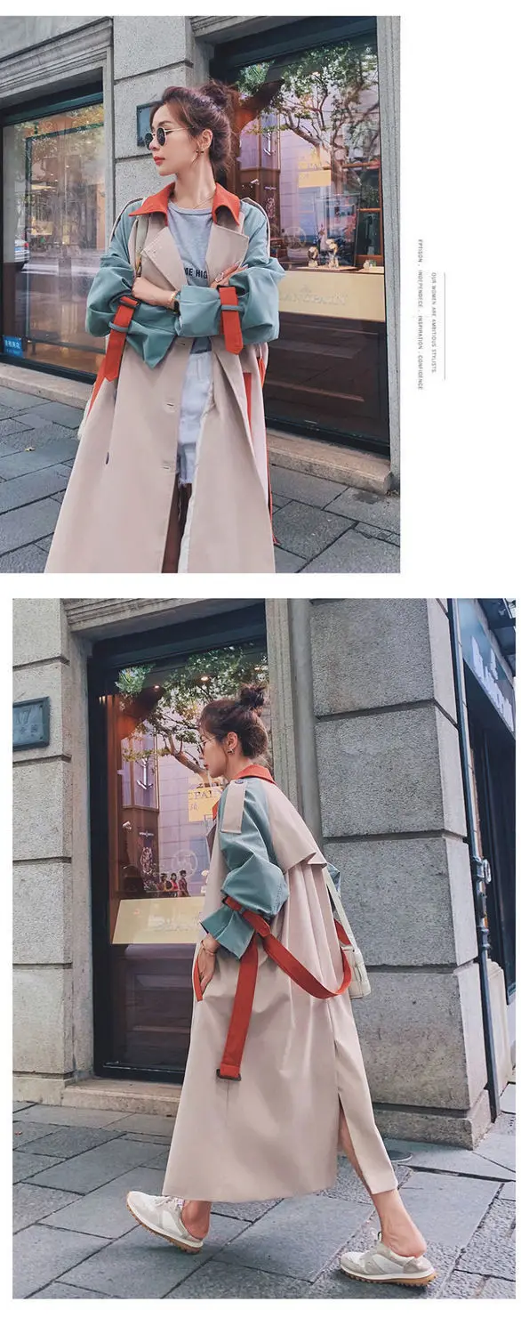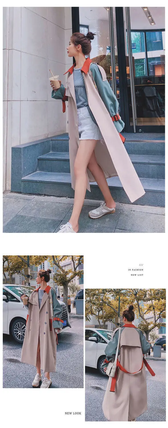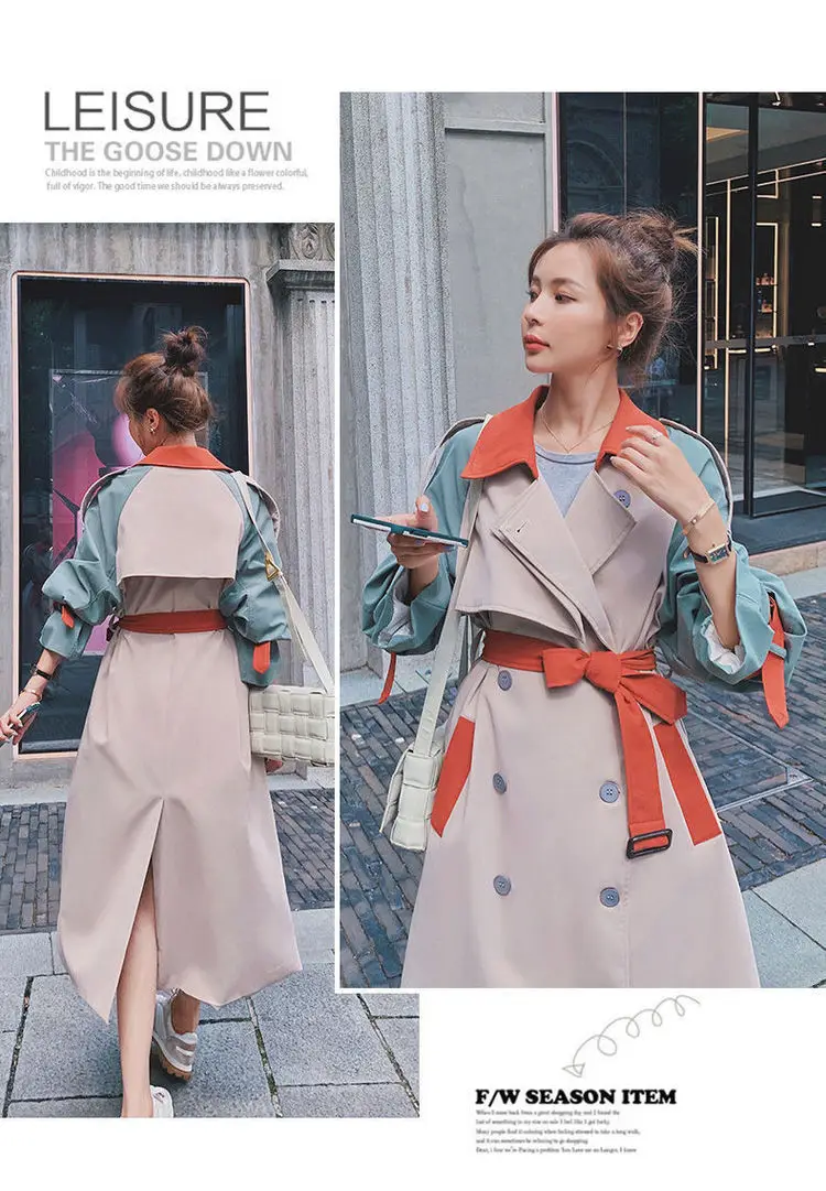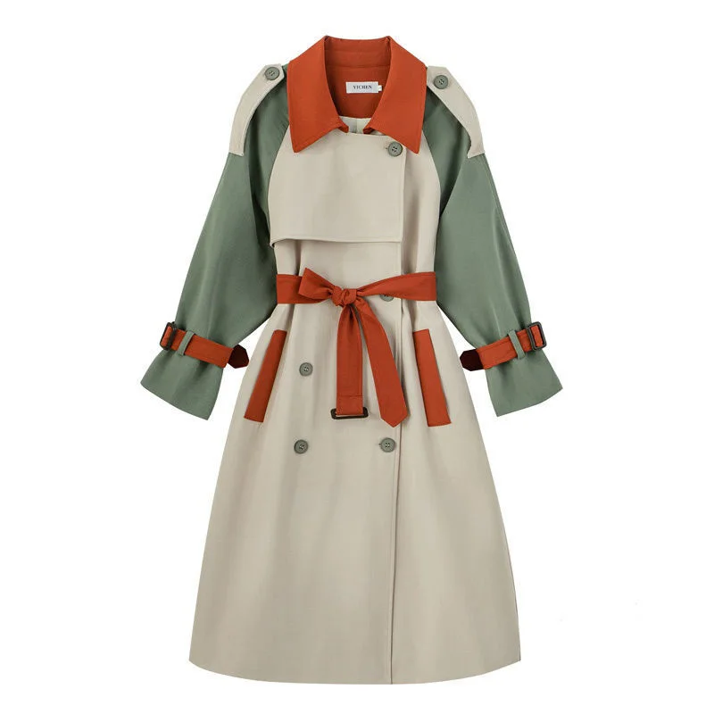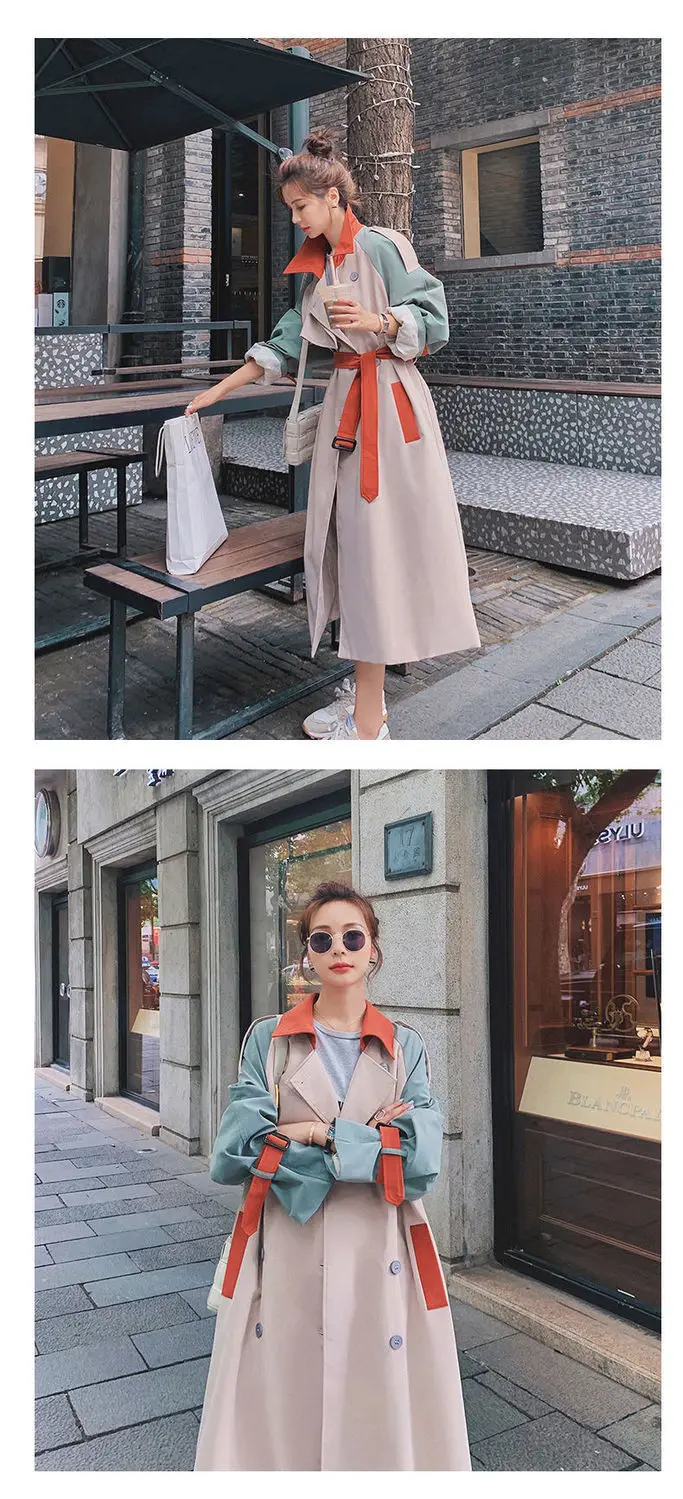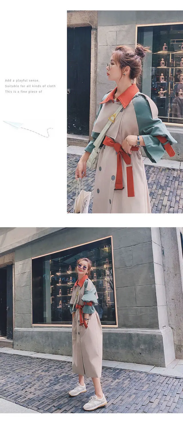 Ветровка женская, средней длины, с контрастными строчками, весна-осень 2021, Корейская версия, свободный пояс, пальто для женщин