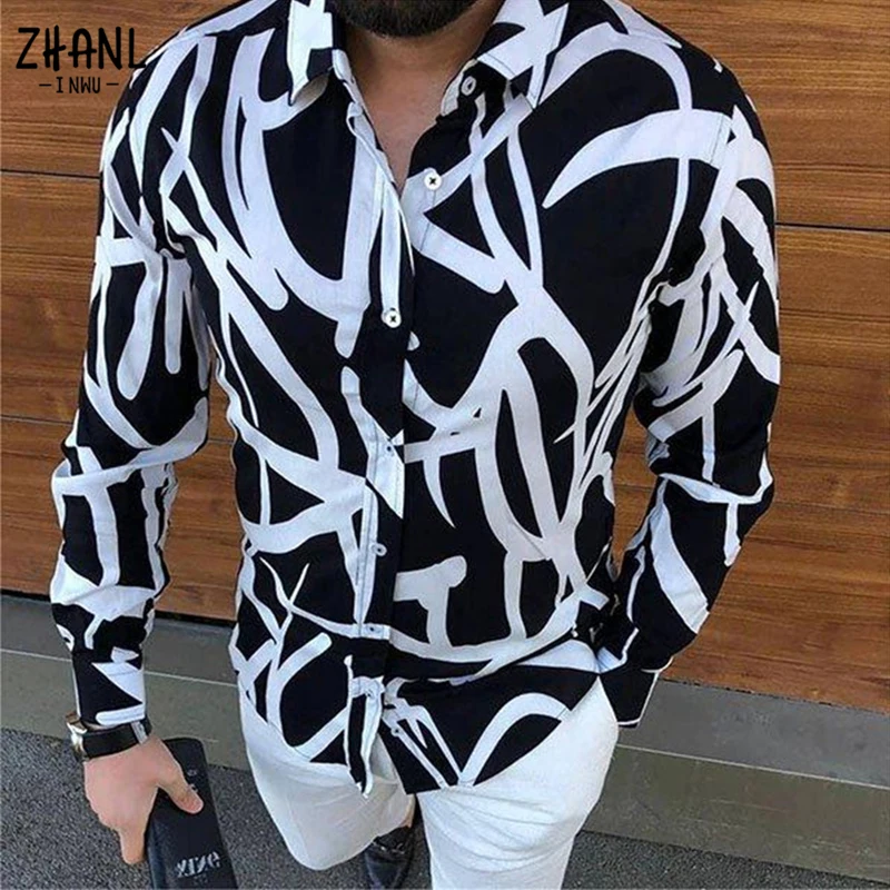 Рубашка мужская приталенная с длинным рукавом, модная повседневная сорочка с винтажным принтом, Черная