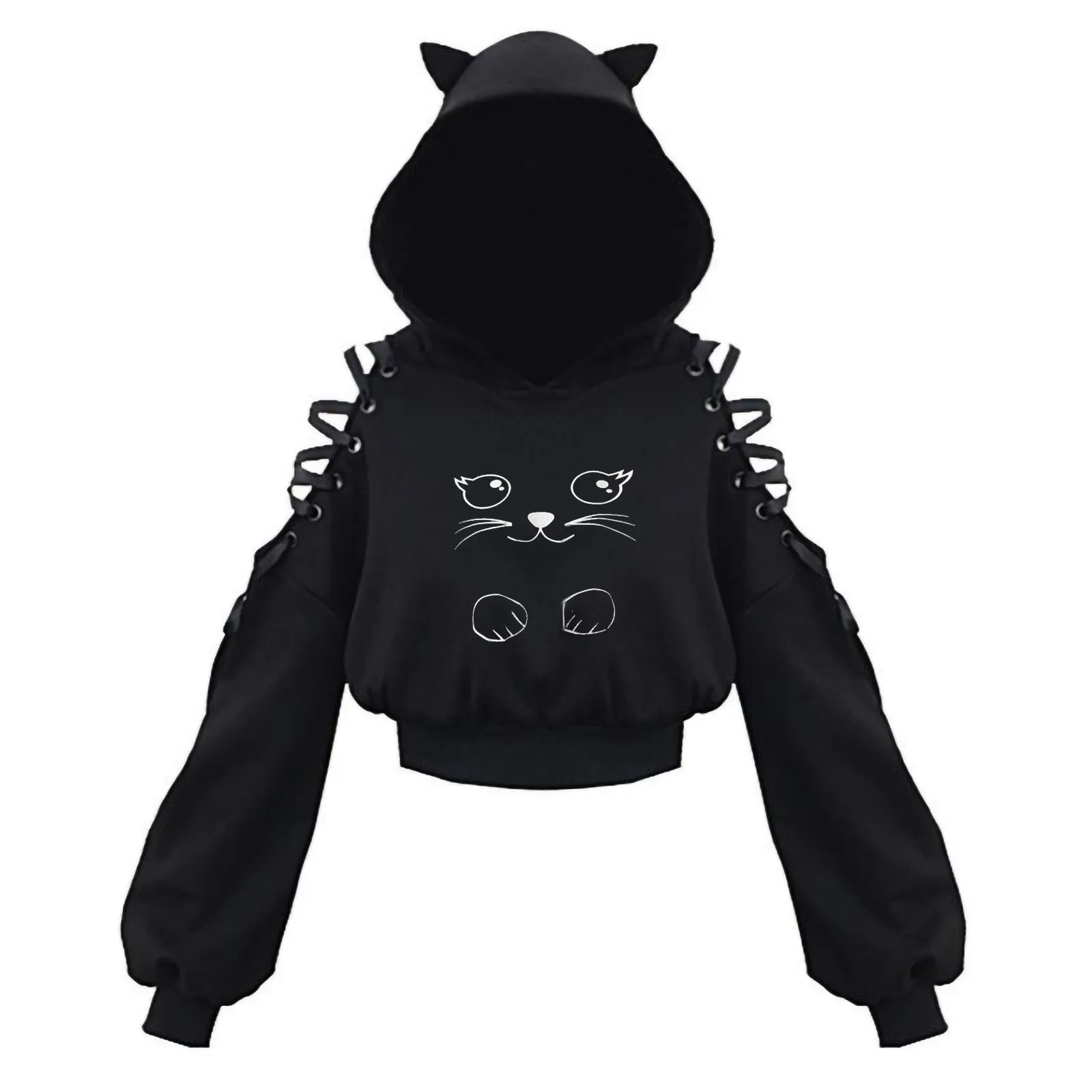 Женский пуловер с длинным рукавом, ажурный свитшот с капюшоном, 2021, толстовки без бретелей, худи с кошачьими ушами